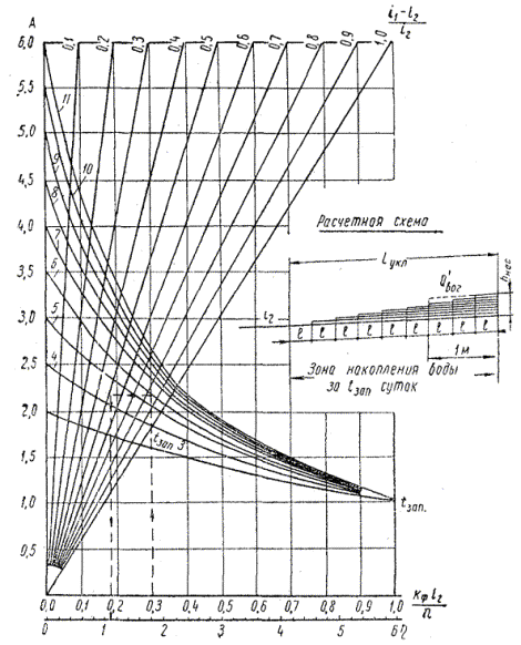 По вертикальной оси отложены значения А, по горизонтальной оси где q - расчетное количество воды в сутки за счет местного поступления. Кривые на номограмме