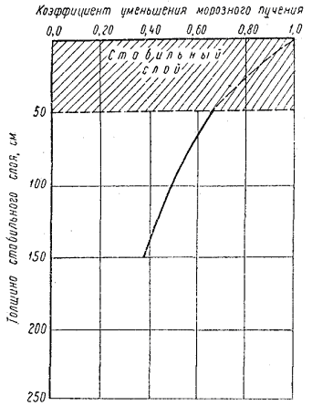 Примечание. Значения показателя В получены расчетным путем по формуле (2) на основании фактических данных о величине пучения дорожных конструкций на эксплуатируемых дорогах, при известных значениях z; z1; H и a0. Рис. 12. Схема к расчету величины пучения: z1 - общая толщина слоев из стабильного материала; H - глубина залегания грунтовых вод; z - глубина промерзания За расчетную длительность зимнего периода принимают: для Европейской части СССР - количество суток с момента наступления осенью температуры воздуха -5 °С до наступления весной периода с устойчивой температурой воздуха выше 0 °С; для Зауральской части СССР, где климат более континентален и выше скорость промерзания, - с момента понижения температуры воздуха до -10 °С в начале зимы до наступления устойчивой температуры воздуха 0 °С весной. Когда не представляется возможным получить достоверные данные о глубине промерзания, максимальную глубину z в данном районе можно принимать по карте Л.Т. Абрамова (рис. 13)* с добавлением к ней для районов Европейской части СССР около 40 см (средняя толщина стабильного слоя) и для Зауральской части СССР - примерно 60 см. В этом случае можно также воспользоваться непосредственно картой изолиний a0 (рис. 14), рассчитанных по формуле (3). * Д.А. Могилевский и др. Изыскания и проектирование аэродромов. Автотрансиздат, М., 1963. 21. Для упрощения расчетов по формуле (2) ее автором составлена номограмма (рис. 15) с помощью которой можно установить величину ожидаемого пучения lпуч при известных значениях параметров z, z1, H, В и a0. С помощью этой номограммы нетрудно также найти и величину любого другого параметра, входящего в формулу (2). Номограмма построена в двух совмещенных сетках прямоугольной, системы координат с общей вертикальной осью
