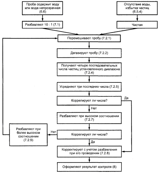 где ρd - плотность разбавителя; ρs - плотность пробы жидкости. 7.2 Проведение анализа (см. рисунок 2) Рисунок 2 - Схема определения загрязнения отобранных проб жидкости с помощью АСЧ 7.2.1 Необходимо нарушить агломерацию частиц и повторно диспергировать частицы, если проба анализируемой жидкости находилась в покое. Для этого сосуд с жидкостью встряхивают при помощи устройства для встряхивания пробы в течение 5 мин (см. 4.7) или при помощи электромеханической мешалки (время размешивания от 5 до 10 мин). 7.2.2 Перед анализом отобранную пробу жидкости дегазируют в устройстве для вакуумирования проб, создавая разрежение не менее 54 кПа (540 мбар) либо помещают в открытую ультразвуковую ванну и выдерживают пробу до тех пор, пока не исчезнут все пузырьки воздуха с поверхности отобранной пробы жидкости (см. 4.11). 7.2.3 Частицы подсчитывают в соответствии с указаниями изготовителя АСЧ при скорости потока жидкости, с которой проводилась его калибровка. 7.2.4 Получают четыре последовательных числа частиц для каждого установленного диапазона размеров частиц анализированной жидкости, одновременно проверяют скорость потока жидкости через датчик. Процесс выполнения статистической проверки АСЧ приведен в приложении В. 7.2.5 Первое число отбрасывают, остальные три усредняют. Результаты анализа пробы жидкости не должны учитываться, если вариация между числами для наименьшего размера анализируемых частиц превышает ±10 % среднего. 7.2.6 Определяют, превышает ли число частиц для наименьшего размера предел погрешности совпадения АСЧ. Примечание - Совпадение вызывает избыток больших и недостаток малых частиц. Предел погрешности совпадения АСЧ (не путать с пределом насыщения) представляет собой максимально допустимый уровень концентрации частиц, который больше минимального установленного изготовителем АСЧ. Измерения проводят при концентрации частиц ниже 50 % указанного изготовителем АСЧ предела погрешности совпадения. Совпадение снижается при разбавлении (см. 7.1). 7.2.7 Если погрешность определения совпадения частиц превышает допустимую (например, нормативные числа частиц, полученные при различных разбавлениях, дают разные результаты или АСЧ показывает излишнюю концентрацию частиц), выбирают оптимальное соотношение разбавления (рекомендуется 10 % жидкой пробы к 90 % разбавителя) и повторяют действия 7.2.1 - 7.2.7. 7.2.8 Если погрешность совпадения частиц отсутствует или не превышает допустимую, продолжают работу с данными, полученными в результате анализа, которые корректируют с учетом соотношения разбавления пробы для получения действительного числа частиц в 1 см3 или в 100 см3 пробы жидкости. 7.2.9 Если погрешность совпадения частиц превышает допустимую, повторяют 7.2.1 - 7.2.5 с более высоким соотношением разбавления, чем выбранное соотношение по 7.2.7, и продолжают анализ. 7.3 Анализ различных жидкостей При использовании датчика для последовательного анализа несовместимых жидкостей необходимо проявлять осторожность. На прозрачных стенках датчика могут быть пленки или жидкость после использования предыдущей жидкости, а это приведет к ошибкам при подсчете. Процедура чередования жидкостей включает в себя промывание несколькими растворителями, каждый из которых совместим с предыдущим. Например, чтобы после воды заливать масло, можно использовать растворители в такой по