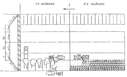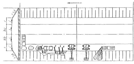 5. Техника безопасности 5.1. При производстве работ по укреплению откосов земляного полотна гидропосевом многолетних трав с мульчированием необходимо соблюдать требования по охране труда, приведенные в соответствующих разделах «Правил техники безопасности при строительстве, ремонте и содержании автомобильных дорог» и СНиП III-4-80 «Техника безопасности в строительстве». 5.2. Машинисты, рабочие и другие работники при выполнении дорожно-строительных работ должны быть обеспечены средствами защиты и специальной одеждой в соответствии с действующими правилами по охране труда и технике безопасности. 5.3. Разработка дополнительных мероприятий по обеспечению безопасности труда не требуется. ТК-08-03-89УКРЕПЛЕНИЕ ОТКОСОВ ОДЕРНОВКОЙ СПЛОШНЫМ ПОКРОВОМ1. Область применения 1.1. Технологическая карта разработана на укрепление одерновкой сплошным покровом откосов насыпей высотой до 3 м с крутизной откоса не более 1 : 1,5. Грунт супесчаный. 1.2. Одерновка откосов сплошным покровом применяется для укрепления откосов насыпей, периодически подтопляемых на короткое время, при высоте волн не более 0,2 м и скорости течения воды до 1 м/с. 1.3. Одерновку сплошным покровом следует применять при наличии дерна в непосредственной близости от места производства работ. 1.4. В состав работ входят: нарезка дерна дернорезом-дерноукладчиком; перемещение и разравнивание растительного грунта на откосе; укладка дерновых лент на откосе; закрепление дерна. 2. Организация и технология производства работ 2.1. До начала производства работ по укреплению откосов необходимо проверить готовность земляного полотна и его соответствие требованиям СНиП 3.06.03-85 «Автомобильные дороги» и СНиП 3.02.01-87 «Земляные сооружения, основания и фундаменты». 2.2. Для одерновки следует применять свеженарезанный луговой дерн из мест с плотным травяным покровом. Перед нарезкой дерна трава должна быть скошена. Применение болотного и поросшего мхом дерна не допускается. Качество дерна выше, если он содержит клевер и злаковые растения (пырей, мятлик). 2.3. Нарезанный дерн хранить более трех дней не рекомендуется. При необходимости хранения дерн следует складировать в штабеля травой к траве, корнями к корням. При жаркой сухой погоде дернины необходимо поливать. 2.4. Работы по одерновке откосов сплошным покровом ведутся комплексной механизированной бригадой на двух захватках площадью 200 м2 каждая (рисунок). Схема организации и производства работ. Операции, выполняемые на захватках: 1-я захватка - выгрузка растительного грунта на откос автосамосвалом III; разравнивание грунта на откосе автогрейдером I; 2-я захватка - укладка дернин на откос дерноукладчиком II; закрепление дернин спицами. 1, 2 - последовательность проходов автогрейдера. Стрелкой указано направление потока. 2.5. Численность комплексной механизированной бригады 5 чел.: Машинист дернореза-дерноукладчика 5 разр............... 1 Машинист автогрейдера 6 разр...................................... 1 Дорожный рабочий 2 разр............................................. 2 То же, 3 разр..................................................................... 1 2.6. Нa первой захватке выполняются следующие технологические операции: нарезка дерна дернорезом-дерноукладчиком; перемещение грунта на откос и его разравнивание автогрейдером. Дернорез-дерноукладчик конструкции СоюздорНИИ (ПКБ) представляет собой сменное оборудование к экскаватору