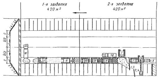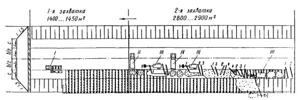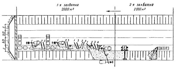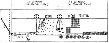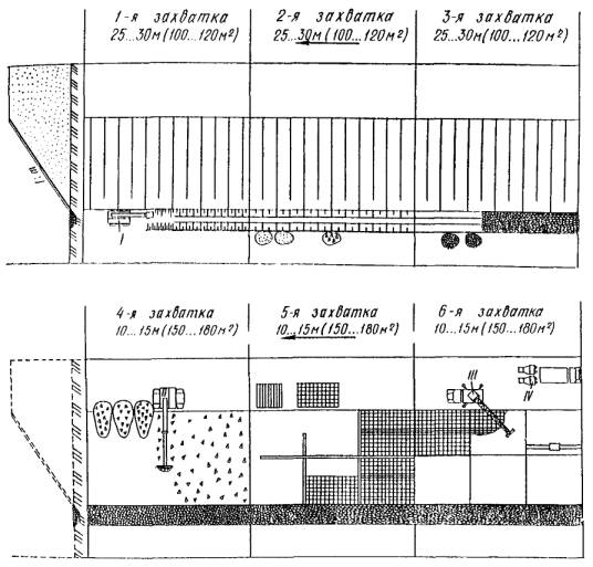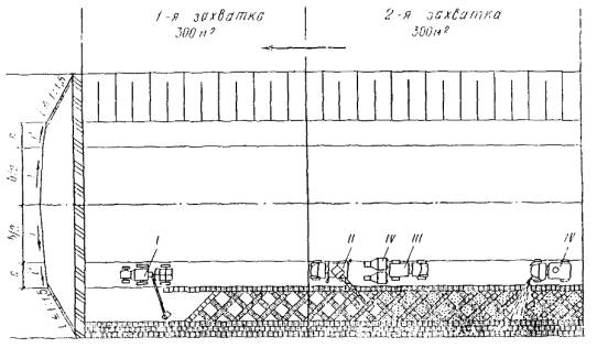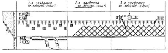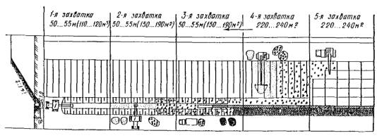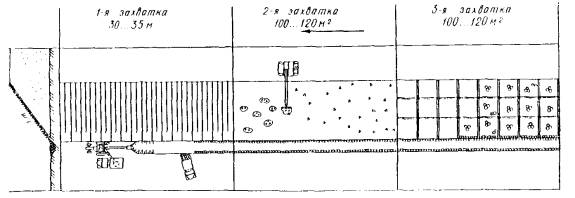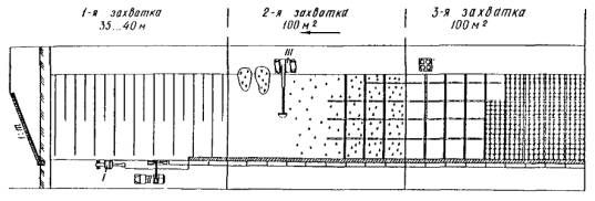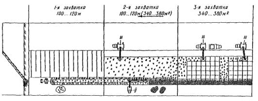 Рабочие владеют смежными профессиями, что позволяет достичь равномерной загрузки членов бригады. 2.5. Работы по укреплению откосов насыпи у малых мостов ведет комплексная механизированная бригада на трех захватках (рисунок). 2.6. На первой захватке выполняют следующие технологические операции: рытье траншеи под бетонный упор экскаватором; срезка недобора грунта вручную; установка бетонных блоков упора с помощью автокрана; обратная засыпка пазух траншей с трамбованием; устройство бетонной ленты. Для рытья траншеи под упор используют экскаватор ЭО-2621А с обратной лопатой (ковш вместимостью 0,25 м3). Траншею прокладывают вдоль подошвы откоса земляного полотна согласно разбивочным точкам на глубину, несколько меньшую проектной. Углубляют дно траншеи и доводят ее геометрические размеры до проектных вручную вслед за экскаваторными работами. Бетонные блоки разгружают автокраном КС-2561 грузоподъемностью 5 т, равномерно раскладывая их вдоль траншеи. Для раскладки блоков привлекаются два такелажника из числа рабочих, входящих в звено по устройству бетонного упора. Блоки устанавливают на основание из бетона или цементного раствора с последующей заливкой швов цементным раствором и расшивкой швов. По мере устройства бетонного упора засыпают пазухи траншеи грунтом вручную. Засыпка производится слоями с разбивкой комьев грунта и послойным уплотнением пневматической трамбовкой. При необходимости в процессе уплотнения грунт поливают водой. Бетонную ленту вдоль бетонного упора устраивают через 7 ... 10 дней после установки и омоноличивания блоков бетонного упора (время, необходимое для набора бетоном прочности). Для устройства бетонной ленты применяется бетон гидротехнический класса В15. Бетонную смесь на объект строительства доставляют автомобилями-самосвалами ЗИЛ-ММЗ-555 и выгружают равномерно на два-три поддона у края бетонного упора. Сменная производительность звена из 6 чел. при устройстве упора - 35 ... 40 м. Калькуляция трудовых затрат на устройство 100 м упора приведена в табл. 1. 2.7. На второй захватке выполняются следующие технологические операции: разравнивание щебня на откосе универсальной землеройно-планировочной машиной; окончательная планировка щебеночной подготовки вручную; уплотнение щебеночной подготовки трамбовкой; раскладка элементов на откосе с помощью автокрана; установка асфальтовых планок. Щебень для устройства подготовки завозят автомобилями-самосвалами и выгружают так, чтобы основная его часть попадала сразу на откос. Дальнейшее распределение и планировка щебня производятся универсальной землеройно-планировочной машиной Э-4010 с верхней стоянки. Если вылет стрелы не обеспечивает распределение щебня по всей длине откоса, работу необходимо выполнять с верхней и нижней стоянок машины. После планировки откоса с одной стоянки универсальную землеройно-планировочную машину перемещают по фронту работ на 2,3 ... 2,4 м и продолжают работу, перекрывая спланированную полосу на 10 ... 20 см. По окончании планировки универсальную землеройно-планировочную машину используют на других работах. Окончательная планировка поверхности подстилающего слоя после механизированного разравнивания выполняется вручную (доработка поверхности подстилающего слоя, выравнивание краев, снятие лишнего материала, подсыпка заниженных мест