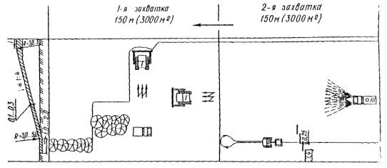 4.2. Потребность комплексной механизированной бригады в машинах, оборудовании и приспособлениях определена из расчета их оптимальной загрузки: Бульдозер ДЗ-53 (Д-686) на тракторе С-100............................ 1 Дорожная фреза ДС-18 (Д-530)................................................. 1 Распределитель цемента ДС-9 (Д-343В).................................. 1 Цементовоз ТЦ-3 (С-853)........................................................... 1 Поливочно-моечная машина ПМ-130....................................... 1 Экскаватор-драглайн Э-10011 с прицепным виброкатком.... 1 Автогудронатор ДС-39А (Д-640).............................................. 1 5. Техника безопасности 5.1. При производстве работ по укреплению откосов грунтами, обработанными цементом, необходимо соблюдать требования по охране труда, приведенные в соответствующих разделах «Правил техники безопасности при строительстве, ремонте и содержании автомобильных дорог» и СНиП III-4-80 «Техника безопасности в строительстве». 5.2. Машинисты, рабочие и другие работники при выполнении дорожно-строительных работ должны быть обеспечены средствами защиты и специальной одеждой в соответствии с действующими правилами по охране труда и технике безопасности. 5.3. Разработка дополнительных мероприятий по обеспечению безопасности труда не требуется. ТК-08-07-89УКРЕПЛЕНИЕ ОТКОСОВ ТОРФО-ПЕСЧАНОЙ СМЕСЬЮ1. Область применения 1.1. Технологическая карта разработана на укрепление откосов земляного полотна высотой до 3,5 м крутизной 1 : 1,5. 1.2. Торфо-песчаная смесь с последующим засевом травами применяется при укреплении откосов земляного полотна в районах, где растительный грунт представлен почвами, в биологическом отношении мало пригодными для произрастания трав, или там, где растительный грунт дефицитен. 1.3. В состав работ входят: разравнивание песка и торфа на обочине автогрейдером; перемешивание песка с торфом автогрейдером; перемещение торфо-песчаной смеси на откос автогрейдером; разравнивание смеси на поверхности откоса; засев откоса многолетними травами с поливкой водой. 2. Организация и технология производства работ 2.1. До начала работ по укреплению откосов необходимо проверить готовность земляного полотна и его соответствие требованиям СНиП 3.06.03-85 «Автомобильные дороги» и СНиП III.02.01-87 «Земляные сооружения, основания и фундаменты». 2.2. Работы по укреплению откосов ведет комплексная механизированная бригада поточным методом на двух захватках площадью 2000 м2 каждая (рисунок). Длина захватки определяется в зависимости от ширины откоса. 2.3. Численность комплексной механизированной бригады 5 чел.: Машинист автогрейдера 6 разр...................................... 1 » экскаватора 6 разр....................................... 1 Помощник машиниста 6 разр......................................... 1 Машинист поливочно-моечной машины 4 разр.......... 1 Дорожный рабочий 3 разр............................................. 1 2.4. На первой захватке выполняются следующие технологические операции: разравнивание песка автогрейдером; разравнивание торфа автогрейдером; перемешивание песка с торфом автогрейдером; перемещение торфо-песчаной смеси на откос; разравнивание смеси на поверхности откоса. Торфо-песчаную смесь готовят на обочине путем смешения ее составляющих (торфа и песка) автогрейдером ДЗ-31-1. Соотношение торфа и песка в смеси определяется для каждого конкретного случая в зависимости от местных условий. Ориентировочно содержание торфа в смеси 70 ... 80, песка - 20 ... 30 %. Схема организации и производства работ. 