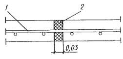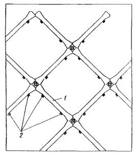 Щиты опалубки изготавливают два плотника 2-го и 3-го разр. из сборных строганых досок толщиной 25 ... 40 мм шириной 30 ... 50 см (в зависимости от сечения упора). Для устройства бетонного упора применяется гидротехнический бетон класса В15. Бетонная смесь доставляется на объект строительства автомобилями-самосвалами ЗИЛ-ММЗ-555 и выгружается у края траншеи. Опалубку заполняют бетонной смесью вручную. Уплотняют бетон глубинным вибратором. Упор устраивают за неделю до монтажа решетчатых конструкций, чтобы бетон достиг прочности, позволяющей дальнейшее производство работ. По мере твердения бетонной смеси опалубку разбирают и очищают. Пазухи траншеи засыпают вручную ранее вынутым грунтом. Засыпка производится слоями с разбивкой комьев грунта и послойным уплотнением их ручной трамбовкой. В процессе уплотнения при необходимости грунт поливают водой. Калькуляция трудовых затрат на устройство 100 м монолитного бетонного упора приведена в табл. 1. Сменная производительность звена из 6 чел. при устройстве упора - 40 ... 60 м. 2.6. Картой предусматривается вариант устройства упоров из сборных блоков размерами 200´20´34 см. Раскладывают и устанавливают их с помощью грузоподъемных механизмов (автокраны, машины с грузоподъемником, экскаваторы с навесным оборудованием). Блоки устанавливают на основание из бетона или цементного раствора с последующей заливкой швов цементным раствором и их расшивкой. Сменная производительность звена из 7 чел. при монтаже сборных бетонных блоков - 40 ... 50 м упора. Калькуляция трудовых затрат на устройство 100 м упора из сборных блоков приведена в табл. 1. 2.7. При укладке решетчатых конструкций с диагональным и прямоугольным расположением элементов упорами могут служить элементы нижнего пояса. 2.8. На второй захватке выполняются следующие технологические операции: раскладка железобетонных элементов на откос автокраном; укладка железобетонных элементов на поверхность откоса вручную; забивка металлических штырей; омоноличивание стыков цементным раствором. Разгрузка железобетонных элементов предусматривается автокраном КС-2561Д кассетным способом с равномерной раскладкой элементов на обочине или на поверхности откоса. Для раскладки элементов привлекаются два такелажника из числа дорожных рабочих, входящих в звено по монтажу элементов решетчатой конструкции. К монтажу элементов решетчатой конструкции приступают на участке лекальной кривой конуса, ведя работы снизу вверх начиная от бетонного упора. Элементы укладывают на поверхность откоса по разбивочным линиям и временно закрепляют деревянными колышками (рис. 3). В процессе укладки устраняют неровности на поверхности откоса и следят, чтобы элементы плотно примыкали к ней. При подаче железобетонных элементов к месту укладки вручную их спускают по уложенным на откосе доскам. В местах стыковки укладываемых элементов забивают металлические штыри. Металлические штыри, скобы и монтажные петли элементов перед укладкой смазывают битумом. Если в узлах крепления решетчатых конструкций предусматривается устройство железобетонных сваек, предварительно мотобуром ДС-10 бурят отверстия заданного диаметра и глубины. Рис. 3. Временное крепление узлов решетки при монтаже: 1 - сборный железобетонный элемент; 2 - деревянные колышки. По окончании забивки металлических штырей (сваек