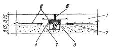 Каменная призма устраивается по готовой щебеночной подготовке. В целях обеспечения жесткости конструкции пустоты между камнями нижних рядов заполняют мелкими камнями и засыпают каменной мелочью. Сменная производительность звена из 12 чел. при устройстве рисбермы - 25 ... 30 м пог. длины. Калькуляция трудовых затрат на устройство 100 м рисбермы на глубину 1 м приведена в табл. 1. 2.11. На четвертой захватке выполняются следующие технологические операции: разравнивание щебня на откосе земляного полотна универсальной землеройно-планировочной машиной; окончательная планировка щебеночной подготовки вручную; уплотнение щебеночной подготовки трамбовкой. Щебень для устройства подготовки завозят автомобилями-самосвалами и выгружают так, чтобы основная его часть попадала сразу на откос; дальнейшее распределение щебня производится универсальной землеройно-планировочной машиной Э-4010 с верхней стоянки. Если вылет стрелы не обеспечивает распределение щебня по всей длине откоса, работу следует выполнять с верхней и нижней стоянок механизма. После планировки откоса с одной стоянки универсальную землеройно-планировочную машину перемещают по фронту работ на 2,3 ... 2,4 м и процесс повторяют, перекрывая спланированную полосу на 10 ... 20 см. Окончательная планировка поверхности подстилающего слоя (доработка поверхности, выравнивание краев, снятие лишнего материала, подсыпка его в заниженные места и т.п.) выполняется вручную. Уплотняют щебеночную подготовку с помощью пневмотрамбовки ТР-4, снизу вверх по откосу. В процессе уплотнения при каждом ударе трамбовки должна захватываться часть уже уплотненной площади. 2.12. На пятой захватке выполняются следующие технологические операции: укладка железобетонных элементов на поверхность откоса; устройство гидроизоляционного слоя на железобетонных элементах; установка арматурных сеток и каркасов; укладка досок, пропитанных креозотом. Разгрузка железобетонных элементов, арматурных сеток и каркасов предусматривается автокраном КС-2501 кассетным способом с равномерной раскладкой элементов на обочине или на поверхности откоса. Для раскладки элементов привлекаются два такелажника из числа дорожных рабочих, входящих в звено по монтажу элементов монолитных железобетонных плит. Железобетонные элементы размерами 2,35´0,3´0,15 м укладывают на поверхность откоса по разбивочным линиям и закрепляют металлическими штырями. В процессе работы устраняют неровности на поверхности откоса и следят, чтобы элементы плотно примыкали к ней. Подают железобетонные элементы к месту укладки вручную, спуская их по уложенным на откосе доскам. Рис. 2. Деталь конструктивного шва: 1 - бетон; 2 - бетонный брусок; 3 - железобетонный элемент толщиной 70 мм; 4 - битумный мат толщиной 10 мм; 5 - доска толщиной 20 мм, пропитанная креозотом; 6 - арматурная сетка; 7 - подготовка из гравия или щебня. Битумную мастику наносят вручную щетками за четыре раза по мере укладки железобетонных элементов. Каждый последующий слой мастики наносят после остывания предыдущего. Арматурные сетки и каркасы подают к месту производства работ и укладывают вручную на бетонные бруски. При этом следят, чтобы арматурные сетки были выставлены точно по отметкам. После установки арматуры в швы между плитами укладывают сосновые доски толщиной 2 см, пропитанные креозотом (рис.