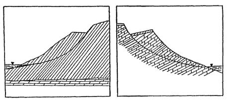 Нскв.расч. = 2,46 - 2,08 ´ 0,47 = 1,48, откуда: Нрасч. = 0,72 ´ 1,48 = 1,07 м Так может быть установлен расчетный уровень грунтовых вод при наличии наблюдений за 10 лет. При меньшем ряде наблюдений установление расчетного уровня таким способом может привести к значительным ошибкам. Второй случай Вблизи трассы, в деревне, находится шахтный колодец. 12/VIII уровень воды в колодце находился на глубине 2,81 метра, а на трассе 2,02 м. На срубе колодца на глубине 1,85 м от поверхности земли заметны следы, характеризующие наивысшее положение уровня. В этом случае Приложение 11Классификация оползней (по ЦНИИС)1. По условиям развития и формам проявления, зависящим от геологической среды и характера залегания пород, оползни можно подразделить на два основных типа, каждый из которых включает в себя оползни рыхлых покровных отложений и коренных пород. Поверхностью скольжения оползней I типа являются геологические контакты, имеющие наклон к подошве склона. Для покровных отложений такими контактами являются наклонные поверхности подстилающих коренных пород (см. рис. 1а), а для коренных пород - наклонные плоскости наслоений или зоны тектонических нарушений (см. рис. 1б). Поверхность скольжения оползней I типа имеет форму поверхности геологического контакта. 2. Оползни II типа характерны тем, что поверхность скольжения у них не совпадает с геологическими контактами, а образуется в однородной геологической среде и имеет, как правило, криволинейно вогнутое очертание (см. рис. 1в, г). Иные формы проявления оползневых процессов, получавших название оползней выдавливания, пластических оползней, являются разновидностью преимущественно оползней II типа. В процессе движения оползней I типа в языке и голове их могут возникать отдельные блоки оползней II типа. Основными условиями для возникновения оползней являются: - для оползней I типа - наличие геологических контактов, наклоненных в сторону подошвы склона, а также соответствующий литологический состав грунтов и пород; - для оползней II типа - соответствующий литологический состав и консистенция рыхлых грунтов, трещиноватость и степень выветрелости коренных пород. Более подробная классификация оползней с указанием для каждой разновидности оползней методики расчета устойчивости оползневого склона, помещена в книге Браславского Б.Д., Львовича Ю.М. и др. «Противооползневые конструкции на автомобильных дорогах» (Москва, 1985 г.). ОПОЛЗНИ I ТИПА а) Контактный оползень покровных накоплений б) Структурный оползень коренных пород