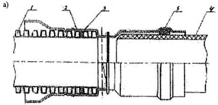 Рис.3. Соединение (а) полиэтиленовых труб с двухслойными стенками с каналами связи условным диаметром 100 мм из других материалов на полиэтиленовых муфтах (б) с уплотнением резиновыми кольцами 1 - ПГТ, 2 - полиэтиленовая муфта, 3, 5 - резиновые кольца, 4 -присоединяемая труба Примечание: размеры муфт должны соответствовать указанным в таблице (ТУ 2248-030-41989945-2005 «Детали соединительные из полиэтилена для гофрированных труб»)