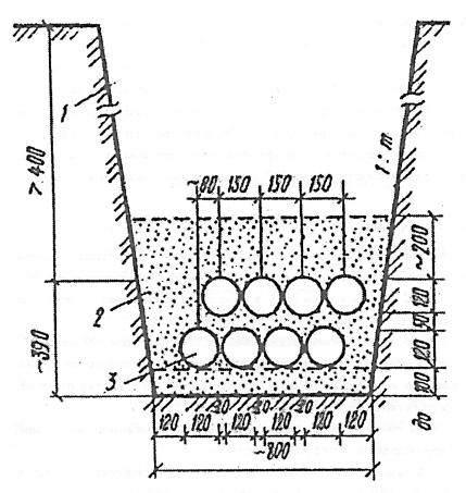 Рис. 4. Пример траншейной прокладки восьмитрубных (два ряда по четыре трубы в каждом ряду) каналов связи со смещением продольных осей ПГТ по ширине траншеи с наклонными стенками 1 - траншея, 2 - засыпка, 3 - ПГТ