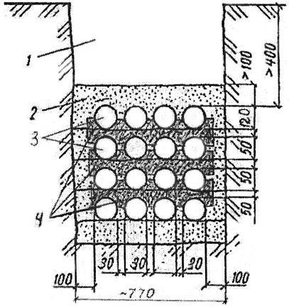Рис. 5. Пример траншейной прокладки шестнадцатитрубных (четыре ряда по четыре трубы в каждом) каналов связи с расположением продольных осей ПГТ друг над другом в траншее с вертикальными стенками с использованием восьмипозиционных опор: ТУ 2248 - 001 - 04000633 - 2005 «Блоки однорядные и многорядные из полиэтиленовых труб с двухслойной стенкой гофрированной наружной и гладкой внутренней диаметром 100 мм для каналов связи» 1 - траншея, 2 - засыпка, 3 - ПГТ, 4 - полимерные опоры В комплекс следует, как правило, включать: - расчистку и планировку территории по направлению трассы прокладки каналов связи; - разработку траншеи; - подготовку дна траншеи к укладке ПГТ; - укладку труб (трубных блоков из ПГТ) в траншею (с фиксацией ПГТ в рядах с помощью полимерных опор); - выравнивание и засыпку труб поштучно или блоков из них; - установку элементов железобетонных колодцев и их сборку; - сопряжение труб со стенками колодцев (фундаментов зданий); - контроль проходного сечения каналов связи; - окончательную засыпку каналов связи; - выполнение заготовки каналов связи. 4.7. В общих случаях последовательность выполнения технологических процессов при монтаже каналов связи из ПГТ следует связывать со способом их прокладки. 4.7.1. При монтаже как однорядных, так и многорядных каналов связи из отдельных ПГТ рекомендуется придерживаться последовательности выполнения технологических процессов, указанной в табл. 4. Таблица 4. Технологическая последовательность однорядной и многорядной прокладки каналов связи из ПГТ