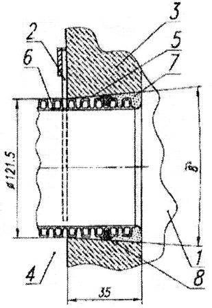 Рис.6. Схема ввода ПГТ в железобетонные телефонные колодцы конструкции ЗАО «Связьстройдеталь» 1 - внугренняя полость колодца, 2 - фиксатор трубы, 3 - стенка колодца, 4 - внешнее пространство, 5 - конусное отверстие в стене, 6 - ПГТ, 7 - цементно-песчаная заделка, 8 - резиновое уплотнение 4.24. Допускается вводить каналы связи из ПГТ с использованием отрезков (длиной 1000 - 1500 мм) из асбестоцементных труб и традиционной заделкой в стенках колодцев (фундаментов). 4.25. Окончательную засыпку каналов связи грунтом, вынутым при разработке траншеи, следует только при наличии над ними песчаного слоя толщиной 200 - 250 мм 4.26. Подготовку к затягиванию кабелей связи в каналы следует выполнять в соответствии с п. 4.15 «Руководства по строительству линейных сооружений местных сетей связи». 5. СДАЧА И ПРИЕМКА КАНАЛОВ СВЯЗИ ИЗ ПГТ5.1. Каналы связи передаются под дальнейший монтаж кабельных сетей при условии качественного выполнения всех технологических процессов, что должно быть отражено в соответствующих журналах по производству работ, а также в актах на скрытые работы. 5.2. Контроль качества прокладки каналов связи из ПГТ осуществляют протаскиванием по ним пробного цилиндра диаметром 92 мм. 5.3. Допускается контролировать качество принимаемых в эксплуатацию каналов связи из ПГТ с использованием телевизионных установок. При этом следует устанавливать степень овализации поперечного сечения труб, возникшей в период от завершения строительства до момента проведения контроля. Она не должна превышать 3 мм, то есть разность горизонтального и вертикального диаметров поперечного сечения труб не должна быть более 6 мм. 6. ТРЕБОВАНИЯ БЕЗОПАСНОСТИ ПРИ ПРОКЛАДКЕ КАНАЛОВ СВЯЗИ ИЗ ПГТ6.1. При монтаже каналов связи из ПГТ следует соблюдать требования безопасности, предусмотренные СНиП 12.1.004 - 91 «Система стандартов безопасности труда. Пожарная безопасность. Общие требования». 6.2. Складские помещения, где могут храниться ПГТ и полиэтиленовые муфты, должны быть оснащены огнетушителями и ящиками с песком. 6.3. При разработке траншей и котлованов для укладки каналов связи из ПГТ и смотровых железобетонных телефонных колодцев земляные работы необходимо выполнять, руководствуясь «Правилами подготовки и производства земляных работ, обустройства и содержания строительных площадок в городе Москве». 6.4. К монтажным работам при прокладке каналов связи из полиэтиленовых труб допускаются лица не моложе 18 лет, предварительно прошедшие медицинское освидетельствование, специальное обучение, вводный инструктаж по технике безопасности и инструктаж на рабочем месте. 6.6. При работе с ПГТ следует учитывать, что переносимый по ровной горизонтальной поверхности груз не должен превышать 500 Н (для мужчин) и 200 Н (для женщин). 6.7. Допускается пользоваться только исправными строительно-дорожными машинами, средствами малой механизации и инструментом. 7 .ОХРАНА ОКРУЖАЮЩЕЙ СРЕДЫ ПРИ ПРОКЛАДКЕ КАНАЛОВ СВЯЗИ ИЗ ПГТ7.1. Меры по охране окружающей среды должны соответствовать требованиям СНиП 3.05.03 -85 и настоящего раздела. 7.2. Полиэтиленовые материалы относятся к группе сильногорючих материалов (Г4) по ГОСТ 12.1.004-91. При работе с полиэтиленовыми трубами и муфтами следует соблюдать правила пожарной безопасности. Для гашения огня используются все имеющиеся средства пожаротушения. В закрытых складских помеще