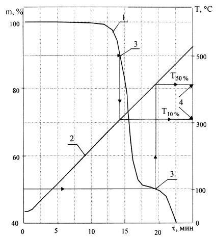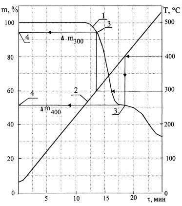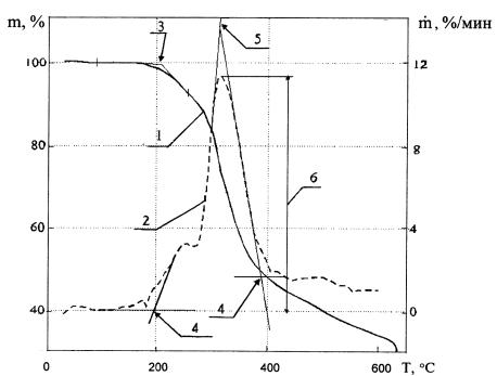 совпадение количества основных (значимых) ДТГ или - значимые термоаналитические характеристики удовлетворяют неравенствам (7) и (10) (пп. 9.4-9.6). 10. СОСТАВЛЕНИЕ ОТЧЕТА. ВЫВОДЫ10.1 На основании проведенных испытаний составляется протокол с указанием соответствующих требований ГОСТ 29127 и п. 14.4. "Порядка проведения сертификации продукции в Системе сертификации в области пожарной безопасности в Российской Федерации" как для материала идентификатора, так и для вновь посту пившего на испытания. 10.2. Протокол испытаний должен содержать: 1) параметры проведения съемки, которые включают: - вид используемого прибора; - тип устройства для измерения температуры; - массу образца; - форму и размер образца; - скорость нагревания; - используемый газ и скорость потока; - тип тигля и дополнительного контейнера для образца; - для автоматизированных приборов скорость съема информации; 2) информацию об образце материала (ГОСТ, ТУ и т.п.); 3) номер аттестата на термоаналитическое оборудование и дату его действия; 4) результаты расчетов характеристик по пп. 5.4, 5.5. 10.3. Образцы протоколов испытаний для идентификатора с указанием рассчитанных средних значений идентификационных характеристик потери и скорости потери массы, температур или их безразмерных аналогов степени и скорости превращения, температур максимумов скоростей превращения, соответствующих расчетных значений СКП, дисперсий (СКП)2 , а также характерных термоаналитических кривых приведены в прил. 2. 10.4. Отчет о проведении идентификации, выполненной по п. 9, должен содержать результаты и выводы по всем методам идентификации (пп. 4.4 - 4.6). 10.4.1. При положительном результате испытаний в выводах указывается, что материалы являются идентичными. 10.4.2. При отрицательном результате испытаний и невыполнении п. 9.6.1 в отчете указываются соответствующие выводы, по результатам которых органом по сертификации проводятся корректирующие мероприятия согласно п.18 "Порядка проведения сертификации продукции в Системе сертификации в области пожарной безопасности в Российской Федерации". 10.5. Отчет заверяется подписями исполнителей и руководителя предприятия, выполнившего работу по идентификации. 11. ТРЕБОВАНИЯ БЕЗОПАСНОСТИ11.1. Рабочее место оператора должно удовлетворять требованиям электробезопасности по ГОСТ 12.1.019-79, ГОСТ 12.3.019-80, ГОСТ Р 50571.1-93. 11.2. Помещение, где эксплуатируются приборы термического анализа, должно соответствовать санитарно-гигиеническим требованиям по ГОСТ 12.1.005-88. ПРИЛОЖЕНИЕ 1Рис. 1. Схема определения характерных значений потерь массы при фиксированных значениях температур (в координатах потеря массы - время): 1 - ТГ-кривая (потеря массы); 2 - температура; 3 - характерные точки ТГ-кривой; 4 - потеря массы при 300 и 400 °С Рис. 2. Схема определения характерных температур при фиксированных значениях потери массы (в координатах потеря массы - время): 1 - ТГ-кривая (потеря массы); 2 - температура; 3 - характерные точки ТГ-кривой; 4 - температуры потери 10 и 50 % массы Рис. 3. Схема определения экстраполированных температур по ТГ (1) и ДТГ (2)-кривым (в координатах сигнал - температура): 3 - экстраполированная температура начала процесса по ТГ-кривой; 4 - экстраполированные температуры начала и окончания процесса по ДТГ-кривой; 5 - экстраполированная температура максимума по ДТГ-кривой; 6 - амплитуда скорости потери массы по ДТГ-кривой Ри