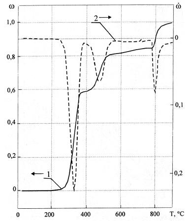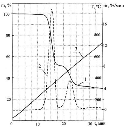 Рис. 1 . Характерные термоаналитические кривые образца материала (в координатах сигнал - время): 1 - ТГ-кривая (потеря массы); 2 - ДТГ-кривая (скорость потери массы); 3 - температура (атмосфера - азот, скорость нагревания - 20 °С/мин)