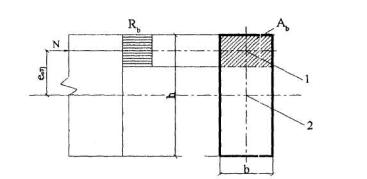 Черт.3.1. Схема усилий и эпюра напряжений в сечении, нормальном к продольной оси внецентренно сжатого бетонного элемента, рассчитываемого по прочности без учета сопротивления бетона растянутой зоны 1-центр тяжести площади сжатой зоны Аь, 2-то же, площади всего сечения В остальных случаях расчет производится на основе нелинейной деформационной модели согласно пп.3.72 - 3.76, принимая в расчетных зависимостях площадь арматуры равной нулю. Допускается при косом внецентренном сжатии прямоугольного сечения расчет проводить из условия (3.1), определяя Аь по формуле