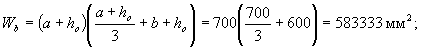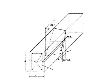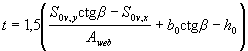 где S0v,y, S0v,x - статические моменты площади Aov относительно соответственно оси х и у; β - угол наклона плоскости действия изгибающего момента к оси х, т.е. ctg β = Mx/My (My - составляющая изгибающего момента в плоскости оси у); bо - расстояние от центра тяжести сечения растянутой арматуры до наиболее сжатой боковой грани ребра (стороны). При расчете прямоугольных сечений значения Aov, S0v,y, S0v,x принимаются равными нулю. Если Аb < Aov или х1 < 0,2h'f, расчет производится как для прямоугольного сечения шириной b = b'f. Если выполняется условие