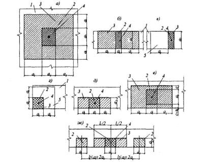 Черт.5.13. Фиксаторы однократного использования, обеспечивающие требуемое расстояние a-в - между отдельными арматурными изделиями; г- между стержнями 1 - разделитель из арматурной стали, устанавливаемый между рядами сеток; 2 - фиксатор-подкладка для обеспечения защитного слоя бетона; 3 - удлиненные поперечные стержни каркаса, загибаемые вокруг стержней сетки, 4 - фиксатор для соединения перекрещивающихся стержней (пространственная спираль из пружинной проволоки); 5 - место связки В растянутой зоне бетона элементов, эксплуатируемых в условиях агрессивной среды, не допускается устанавливать пластмассовые подкладки под стержни рабочей арматуры или вплотную к ним - под стержни распределительной арматуры. В таких изделиях следует применять преимущественно подкладки из плотного цементно-песчаного раствора, бетона или асбестоцемента. 5.54. В случае применения фиксаторов однократного использования следует в соответствии с требованиями табл.5.6 указывать на рабочих чертежах, какие из этих фиксаторов допускаются в данном элементе. Толщину защитного слоя бетона в месте установки фиксатора-подкладки рекомендуется принимать кратной 5 мм.
