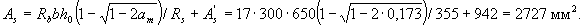 Требуемая площадь растянутой арматуры при условии ее работы с полным расчетным сопротивлением определяется по формуле