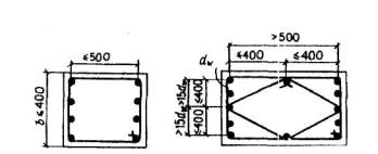 Черт.5.3. Конструкция пространственных арматурных каркасов в сжатых элементах 5.25. В железобетонных стенах поперечные стержни, нормальные плоскости стены, располагаются на расстояниях по вертикали не более 20d, а по горизонтали не более 600 мм. При этом, если требуемая по расчету продольная арматура имеет насыщение меньше минимального процента армирования (см. табл.5.2), поперечные стержни можно располагать на расстояниях по вертикали не более 600 мм, а по горизонтали не более 1000 мм. При насыщении продольной арматуры железобетонных стен более 2% поперечные стержни должны располагаться на расстояниях по вертикали не более 15d и не более 500 мм, а по горизонтали не более 400 мм и не более 2-х шагов вертикальных стержней. В этом пункте d - диаметр вертикальных стержней. 5.26. Поперечную арматуру в плитах в зоне продавливания в направлении, перпендикулярном сторонам расчетного контура, устанавливают с шагом не более ho/3 и не далее 300 мм. Стержни, ближайшие к контуру грузовой площади, располагают не ближе ho/3 и не далее ho/2 от этого контура. При этом ширина зоны постановки поперечной арматуры (от контура грузовой площади) должна быть не менее 1,5ho. Расстояния между стержнями поперечной арматуры в направлении, параллельном сторонам расчетного контура, принимают не более 1/4 длины соответствующей стороны расчетного контура. 5.27. Поперечная арматура в виде сварных сеток косвенного армирования при местном сжатии (смятии) должна удовлетворять следующим требованиям: а) площади стержней сетки на единицу длины в одном и другом направлении не должны различаться более чем в 1,5 раза; б) шаг сеток (расстояние между сетками в осях стержней одного направления) следует принимать не менее 60 и не более 150 мм; в) размеры ячеек сеток в свету должны быть не менее 45 и не более 100 мм; г) первая сетей располагается на расстоянии 15-20 мм от нагруженной поверхности элемента. 5.28. Поперечная арматура, предусмотренная для восприятия поперечных сил и крутящих моментов, должна иметь замкнутый контур с надежной анкеровкой по концам путем приварки или охвата продольной арматуры, обеспечивающую равнопрочность соединений и поперечной арматуры. АНКЕРОВКА АРМАТУРЫ5.29. Анкеровку арматуры осуществляют одним из следующих способов или их сочетанием: - в виде прямого окончания стержня (прямая анкеровка); - с загибом на конце стержня в виде крюка, отгиба (лапки) или петли; - с приваркой или установкой поперечных стержней; - с применением специальных анкерных устройств на конце стержня. 5.30. Прямую анкеровку и анкеровку с лапками допускается применять только для арматуры периодического профиля. Для растянутых гладких стержней следует предусматривать крюки, петли, приваренные поперечные стержни или специальные анкерные устройства. Лапки, крюки и петли не рекомендуется применять для анкеровки сжатой арматуры, за исключением гладкой арматуры, которая может подвергаться растяжению при некоторых возможных сочетаниях нагрузки. 5.31. При расчете длины анкеровки арматуры следует учитывать способ анкеровки, класс арматуры и ее профиль, диаметр арматуры, прочность бетона и его напряженное состояние в зоне анкеровки, конструктивное решение элемента в зоне анкеровки (наличие поперечной арматуры, положение стержней в сечении элемента и др.). 5.32. Базовую (основную) длину анкеровки, необходимую для передачи у