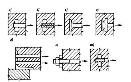 Черт.5.4. Анкеровка арматуры путем устройства на концах специальных анкеров, в виде а - приваренной пластины; б - обжатой пластины; в - высаженной головки; г - высаженной головки с шайбой; д - приваренного стержня к уголку; е - гайки с шайбой снаружи; ж - гайки внутри