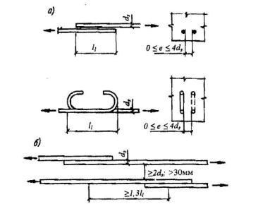 где lо,ап - базовая длина анкеровки, определяемая по формуле (5.1); As,cal, As,ef - см.п.5.33; a - коэффициент, учитывающий влияние напряженного состояния арматуры, конструктивного решения элемента в зоне соединения стержней, количества стыкуемой арматуры в одном сечении по отношению к общему количеству арматуры в этом сечении, расстояния между стыкуемыми стержнями. При соединении арматуры периодического профиля с прямыми концами, а также падких стержней с крюками или петлями без дополнительных анкерующих устройств коэффициент а для растянутой арматуры принимают равным 1,2, а для сжатой арматуры - 0,9. При этом должны быть соблюдены следующие условия: - относительное количество стыкуемой в одном расчетном сечении элемента рабочей растянутой арматуры периодического профиля должно быть не более 50%, гладкой арматуры (с крюками или петлями) - не более 25%; - усилие, воспринимаемое всей поперечной арматурой, поставленной в пределах стыка, должно быть не менее половины усилия, воспринимаемого стыкуемой в одном расчетном сечении элемента растянутой рабочей арматурой; - расстояние между стыкуемыми рабочими стержнями арматуры не должно превышать 4ds (черт.5.6,а); - расстояние между соседними стыками внахлестку (по ширине железобетонного элемента) должно быть не менее 2ds и не менее 30 мм (черт.5.6,б).
