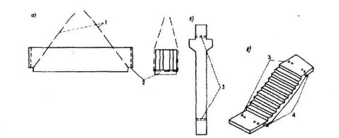 Черт.5.9. Примеры строповочных устройств без петель а - при строповке блока; б - строповочные отверстия в колонне; в – сочетание двух разных строповочных устройств в одном изделии 1 - грузовые стропы; 2 - вырез для захвата; 3 - отверстия для захвата; 4 - петли для захвата при извлечении из формы