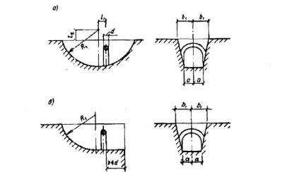 Черт.5.11. Размеры лунок для заглубленного расположения проушин строповочных петель а - замкнутые углубления; б - разомкнутые углубления (на краях изделия) при диаметре стержня петли 6-16мм: R1=125мм, а=30мм, b1=50мм, l1=25мм, l2=30мм; при диаметра петли 18-22мм: R1=150мм, а=40мм, b1=65мм, l1=30мм, l2=30мм Во всех случаях значение ls следует принимать не менее 200 мм. Для петель, выполняемых из арматурной стали Æ25А240 и Æ28А300 и более, значения ls и hb следует увеличивать на 20 %. Ветви петли из стали класса А240, а также прямые (без отгибов) ветви петель из стали класса А300 должны заканчиваться крюками. В необходимых случаях допускается располагать ветви под углом одна к другой не более 45°. Расстояние между боковой поверхностью хвостового участка крюка петли и поверхностью изделия, измеряемое в плоскости крюка, следует принимать не менее 4d (черт.5.10, а). В том случае, если невозможно произвести на необходимую длину запуск концов петли, анкеровку петли необходимо осуществлять различными способами, например приваркой к закладным деталям, заведением за рабочую продольную арматуру и т.д. Надежность принятой анкеровки петли следует подтвердить расчетом или испытаниями. 5.51. Допускается располагать строповочные петли в углублениях так, чтобы их проушины располагались ниже грани бетонного или железобетонного изделия. Это расположение особенно рекомендуется при механизированной отделке поверхности бетона, когда выступающие петли мешают такой отделке. Углубления для петель могут быть замкнутыми (см. черт.5.11, а) или разомкнутыми (черт.5.11, б). В последнем случае в них не скопляется вода, которая может замерзнуть, а также улучшаются условия фиксации петель. Из условия заведения в проушину чалочного крюка стропа лунку следует располагать со смещением к середине изделия относительно плоскости проушины. ФИКСАЦИЯ АРМАТУРЫ5.52. Соответствие расположения арматуры ее проектному положению должно обеспечиваться применением средств фиксации. Фиксацию арматуры рекомендуется осуществлять с помощью: а) устройств однократного использования, остающихся в бетоне; б) инвентарных приспособлений, извлекаемых из бетона до или после его твердения: в) специальных деталей, прикрепленных к рабочей поверхности формы или опалубки и не препятствующих извлечению железобетонного элемента из формы или снятию с него опалубки. 5.53. Рекомендуется применять следующие фиксаторы однократного использования: а) для обеспечения требуемой толщины защитного слоя бетона -по черт.5.12; б) для обеспечения требуемого расстояния между отдельными арматурными изделиями или стержнями - по черт.5.13; в) для обеспечения требований, указанных в подпунктах "а" и "б" - по черт.5.14.