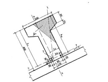 Принимаем 4Æ25(As = 1964 мм2). Пример 9. Дано: сечение размерами b'f = 400 мм, h'f = 100 мм, b = 200 мм, h = 600 мм; а = 70 мм, бетон класса В25 (Rb = 14,5 МПа); растянутая арматура класса А400 (Rs = 355 МПа); площадь ее сечения As = 1964 мм2 (4Æ25); A's = 0,0; изгибающий момент М = 300 кНм. Требуется проверить прочность сечения. Расчет. hо = 600 - 70 = 530 мм. Проверку прочности производим согласно п.3.23, принимая As= 0,0. Так как Rs·As = 355·1964 = 697220 Н > Rb·b'f·h'f =14,5·400·100 = 580000 Н, граница сжатой зоны проходит в ребре, и прочность сечения проверяем из условия (3.28). Для этого по формуле (3.29) определим высоту сжатой зоны, приняв площадь свесов равной А0v = (b'f -b)h'f = (400 - 200) ·100 = 20000 мм2: