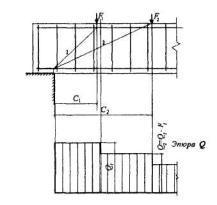 параметру На графике координатам aтх = 0,185 и amy = 0,072 соответствует значение as = 0,20. Тогда согласно формуле (3.42) площадь сечения растянутой арматуры будет равна Аs = (as boho + Aov)Rb/Rs = (0,2·90·360 + 6750)14,5/355 = 540,4 мм2. Принимаем стержни 3Æ16 (Аs = 603 мм2) и располагаем их, как показано на черт.3.8. РАСЧЕТ ЖЕЛЕЗОБЕТОННЫХ ЭЛЕМЕНТОВ ПРИ ДЕЙСТВИИ ПОПЕРЕЧНЫХ СИЛ3.29. Расчет элементов при действии поперечных сил должен обеспечить прочность: - по полосе между наклонными сечениями согласно п.3.30; - на действие поперечной силы по наклонному сечению согласно пп.3.31- 3.42; - на действие момента по наклонному сечению согласно пп.3.43-3.48. Расчет железобетонных элементов по полосе между наклонными сечениями3.30. Расчет изгибаемых элементов по бетонной полосе между наклонными сечениями производят из условия Q < 0,3Rbbho, (3.43) где Q - поперечная сила в нормальном сечении, принимаемая на расстоянии от опоры не менее ho. Расчет железобетонных элементов по наклонным сечениям на действие поперечных силЭлементы постоянной высоты, армированные хомутами, нормальными к оси элемента3.31. Расчет изгибаемых элементов по наклонному сечению (черт.3.9) производят из условия Q < Qb + Qsw, (3.44) где Q - поперечная сила в наклонном сечении с длиной проекции с от внешних сил, расположенных по одну сторону от рассматриваемого наклонного сечения; при вертикальной нагрузке, приложенной к верхней грани элемента, значение Q принимается в нормальном сечении, проходящем на расстоянии с от опоры; при этом следует учитывать возможность отсутствия временной нагрузки на приопорном участке длиной с; Qb - поперечная сила, воспринимаемая бетоном в наклонном сечении; Qsw - поперечная сила, воспринимаемая хомутами в наклонном сечении. Поперечную силу Qb определяют по формуле