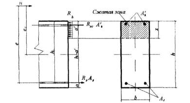 Черт.3.3. Схема усилий и эпюра напряжений в поперечном прямоугольном сечении изгибаемого железобетонного элемента Если вычисленная без учета сжатой арматуры (As= 0,0) высота сжатой зоны х меньше 2а', проверяется условие (3.19), где вместо а' подставляется х/2. 3.19. Изгибаемые элементы