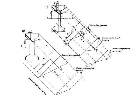 бетона по сечению - где εb,max и εb,min - максимальные и минимальные деформации бетона, определяемые на основе положений, приведенных в п.п.3.72-3.75; х - высота сжатой зоны в направлении, нормальном к нейтральной оси; h - высота сечения в направлении, нормальном условной нейтральной оси (черт 3.39,6); при однозначной эпюре деформаций растянутой