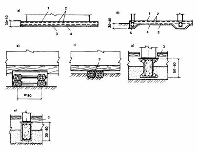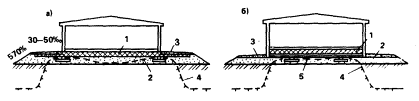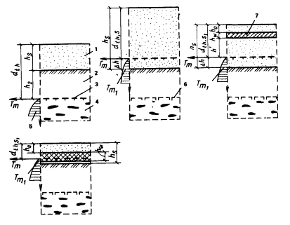 ограниченной зоне протаивания Плиты пенополистирола укладываются с перевязкой швов, заполняемых гидроизоляцией, и закрепляются деревянными штырями. Для обеспечения стока поверхностных вод плиты укладываются с уклоном, повторяющим уклон поверхности подсыпки. 8.9. При применении теплоизоляции для регулирования температурного режима основания рекомендуется принимать во внимание следующее: сохранение вечномерзлого состояния грунтов под зданиями без подполий за счет увеличения термического сопротивления пола может быть достигнуто только при небольшом сроке их службы на одной площадке в районах с низкими среднегодовыми температурами воздуха; утепление отмосток для уменьшения глубины сезонного промерзания у здания без подполья увеличивает глубину многолетнего протаивания грунтов под его серединой, что может вызвать необходимость дополнительного заглубления фундаментов; в этих случаях для исключения нормальных сил пучения под подошвами малозаглубленных фундаментов может оказаться более целесообразной сдвижка их внутрь здания (рис. 26); аналогичную сдвижку фундаментов в плане целесообразно производить и под зданиями с вентилируемыми подпольями, проектируя утепленные отмостки лишь там, где эта сдвижка не может быть произведена по конструктивным условиям. 8.10. Возможные схемы применения подсыпок показаны на рис. 27: схема I - теплозащитная подсыпка, устраиваемая для сохранения природного положения ВГВМ с целью предупреждения сезонного протаивания грунтов с повышенной льдистостью (ii > 0,1), либо конструктивная подсыпка, устраиваемая для уменьшения влияния нормальных сил пучения на незаглубленные и малозаглубленные фундаменты; схема II - конструктивная подсыпка, устраиваемая для опирания на нее фундаментов и обеспечения необходимой несущей способности природных грунтов, что достигается понижением их максимальной температуры на уровне природной поверхности до требуемой; схема III - то же, но с применением слоя эффективной теплоизоляции для уменьшения толщины подсыпки; схема IV - частный случай схемы III, соответствующий минимальной толщине подcыпки. Рис. 27. Схемы теплоизоляционных подсыпок (I-IV)