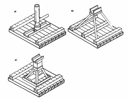 буроопускные сваи (по материалам, института "Фундаментпроект") Все деревянные фундаментные конструкции антисептируются, а железобетонные и стальные защищаются антикоррозийным покрытием в соответствии со СНиП 2.03.11-85 "Защита строительных конструкций от коррозии". Антисептирование, а также нанесение защитного покрытия, производится лишь на той части фундамента, которая находится выше верхнего горизонта вечной мерзлоты. 1.10. Для фиксирования разбивочных осей в здании и выравнивания отметок верха свай и стоек столбчатых фундаментов на последние могут устанавливаться оголовки. Оголовки устраиваются, как правило, съемными с целью их повторного использования при передислокации здания (рис. 9-12).