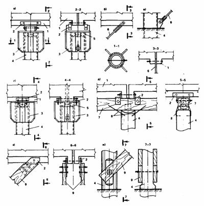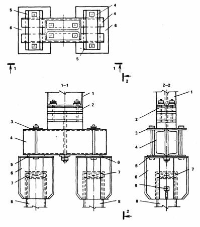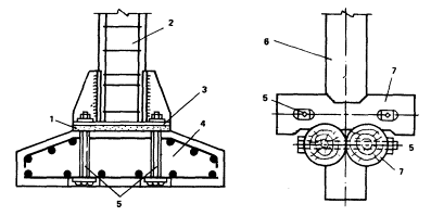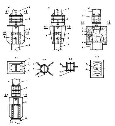 Рис. 10. Опорный узел каркасного здания 1.12. Проектирование фундаментов рекомендуется выполнять, как правило, в следующем порядке: оцениваются мерзлотно-грунтовые и климатические условия площадки (пп. 2.1-2.4) и проверяется соблюдение требований по защите площадки, указанных в пп. 3.5-3.7; вычисляются расчетные глубины сезонного протаивания (или промерзания) грунтов на площадке (п. 5.6, СНиП II-18-76) и многолетнего протаивания под зданием (пп 7.1-7.4); устанавливается принцип использования вечномерзлых грунтов в качестве основания (п. 3.1) в условиях природного их сложения, а так же при регулировании их температурного режима в случае необходимости путем применения подсыпки или теплоизоляции; выявляются возможные варианты фундаментов, производится их сопоставление и выбор проектного решения (пп. 1.6 - 1.8); выполняется детальное проектирование оснований и фундаментов выбранного типа по рекомендациям разд. 9-12.