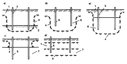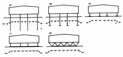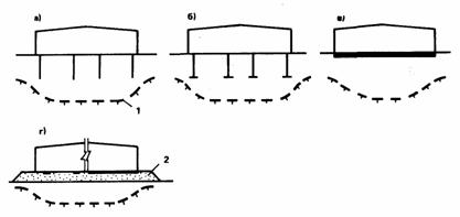 Рис. 17. Схемы фундаментов при принципе II 3.5. Одновременно с выбором принципа использования вечномерз-лых грунтов как оснований должны быть установлены необходимые мероприятия по охране окружающей среды, защите площадки от подтопления и таких опасных для зданий мерзлотных процессов, как термокарстовые образования, солифлюкция, оползни, наледи, бугры пучения, эррозия и др. Проектные решения дорог, инженерных сетей и вводов их в здания принимаются в соответствии с выбираемым принципом использования грунтов в качестве основания. 3.6. При проектировании фундаментов необходимо убедиться в том, что температурный режим оснований мобильных зданий находится вне влияния подземных инженерных сетей, в особенности тепловых, влияние которых может сказываться на расстоянии до 15 м, а в случае фильтрации подогреваемых ими подземных вод - на многие десятки метров. Подземные вводы не должны служить дренажами, подводящими надмерзлотные воды к основанию, для чего при сроке эксплуатации зданий более трех лет предусматриваются противофильтрационные диафрагмы из слабо-фильтрующих глинистых грунтов. Во всех случаях подземные вводы санитарно-технических сетей могут устраиваться только в вентилируемых наружным воздухом каналах, запроектированных на основании расчета, в котором должно быть также выявлено их влияние на расчетную температуру грунта у фундамента. 3.7. Для исключения влияния поверхностных вод на проектный температурный режим основания поверхность грунта, прилежащая к зданию (а при устройстве подполий и под ним), должна быть спланирована и при фильтрующих грунтах сезонно протаивающего слоя защищена покрытием. Уклоны спланированной поверхности с асфальтовым или бетонным покрытием рекомендуются не менее 5%, с грунтовыми - не менее 10%, и без покрытия - не менее 30%в.Для отмосток с асфальтовым или бетонным покрытием уклоны обычно принимаются равными 30-50 %. Вертикальная планировка участка застройки должна исключать образование замкнутых контуров, из которых невозможен или затруднен поверхностный сток воды. С другой стороны, должны быть исключены сосредоточенные потоки сбрасываемой поверхностной воды, приводящие к образованию термокарста или наледей. 3.8. Ожидаемая осадка оттаивающего основания при выборе принципа использования грунтов вычисляется по формуле где n