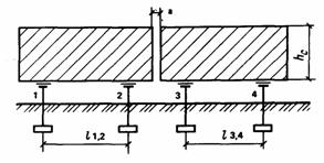 соответственно между фундаментами (краевыми точками) 1, 2 и 3, 4; hc - высота блок-контейнера или отсека (при сопряжении отсеков разной высоты значение hc принимается как наименьшее), рис. 18. Значение зазора между блок-контейнерами (отсеками) не ограничивается, если фундаменты опираются на малодеформируемые грунты, например, скальные, малосжимаемые при оттаивании (е < 0,02) , подсыпку из непучинистых материалов, запроектированную из условия отсутствия сезонного протаивания природных пучинистых грунтов и т.п.