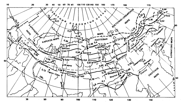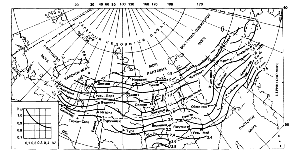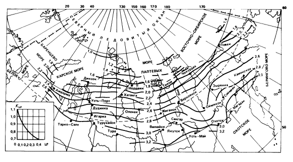 Примечание. Знаком «*» обозначена вода, в порах грунта незамёрзшая. Рис. 24. Карта значений t1 (ч) 5.6. Расчетная глубина сезонного протаивания грунтов dth определяется через нормативную dth,n по формуле где kh’ - коэффициент теплового влияния, принимаемый равным у наружных стел под отмостками с асфальтовым и другим черным покрытием - 1;2; то же, без таких покрытий - 0,9; у внутренних опор - 0,8. 6. РАСЧЕТНЫЕ ТЕМПЕРАТУРЫ ГРУНТОВ6.1. При использовании вечномерзлых грунтов по принципу I применяются следующие их расчетные температуры: при расчете столбчатых фундаментов Тm - максимальная на глубине z от ВГВМ; при расчете свай - Тe - эквивалентная в пределах глубины z; Tz -расчетная на глубине z. 6.2. Расчетные температуры Т для зданий с холодным подпольем, когда не производится предпостроечное охлаждение основания или не предусматривается повышение природных температур вечномерзлых грунтов, вычисляются по формуле (12) ; в остальных случаях - по указаниям СНиП II-18-76. где T0