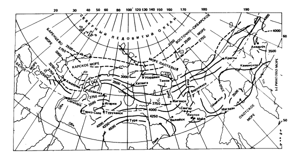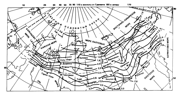 Рис. 19. Изолинии глубин сезонного протаивания глинистых грунтов