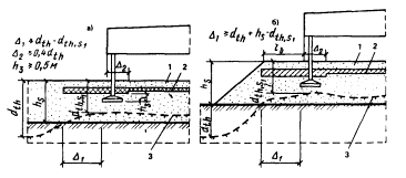 сопротивлением R = hs / 7.4. Если определенная расчетом или по таблицам глубина протаивания под краем здания dе составляет менее 1,5 dth,n, где dth,n нормативная глубина сезонного протаивания грунта, определяемая по п. 5.6, то в качестве dе принимается наименьшее из двух значений 1,5 dth,n и dc (но не менее dth,n). 8. ПОДСЫПКИ8.1. Подсыпки на площадках, застраиваемых мобильными зданиями, по функциональному назначению подразделяются на: планировочные, предназначенные только для выравнивания природного рельефа, организации поверхностного стока атмосферных вод и защиты площадки от подтопления паводковыми водами; теплозащитные, устраиваемые не только для планировки площадки, но и для ее защиты от недопустимых деформаций, которые могут возникнуть в результате изменения положения верхнего горизонта вечномерзлых грунтов при застройке; конструктивные, отсыпаемые с целью создания на поверхности природных грунтов слоя из непучинистых грунтов, способного воспринимать нагрузки от фундаментов малого заложения и уменьшать или исключать нормальные силы морозного пучения природных грунтов; как правило, такие подсыпки одновременно являются и теплозащитными. Планировочные и теплозащитные подсыпки разрабатываются в составе проекта вертикальной планировки всей застраиваемой площадки, Теплозащитные и конструктивные подсыпки для отдельных зданий или их групп проектируются в соответствии с рекомендациями п. 8.2 - 8.16. В районах, где температура вечномерзлых грунтов на глубине 10 м выше -2°С, возможность применения подсыпки при использовании вечномерзлых грунтов оснований по принципу I должна быть подтверждена мерзлотным прогнозом, как для всей осваиваемой территории в целом, так и для площадок отдельных зданий. При использовании оснований по принципу II подсыпки могут применяться без ограничений, 8.2. При проектировании подсыпки в плане необходимо избегать замкнутых контуров, из которых затруднен сток поверхностных вод, и фильтрацию через нее воды, поскольку это приводит к образованию таликов в ее основании, дополнительному увлажнению пучинистых грунтов и заиливанию насыпных. Рекомендуется предусматривать отвод поверхностных и надмерзлотных вод при помощи мерзлотных валиков, неглубоких канав (глубиной до 0,5 м), открытых дренажей и при необходимости устраивать водонепроницаемые диафрагмы. Планировка срезкой применяется в исключительных случаях при малольдистых вечномерзлых грунтах (ii < 0,03). 8.3. Ширина бермы подсыпки (расстояние от поверхности наружной стены здания до бровки откоса) 1, назначается по условиям эксплуатации застраиваемой площадки и с учетом требований производства работ при монтаже здания, но она должна быть не менее принятой в расчете (п. 8.11 - 8.15) и не менее 1,5 м; при неглубоком залегании кровли сильнольдистых грунтов (менее 1 м от природной верхней границы вечной мерзлоты) - не менее 3 м. Крутизна откосов принимается в зависимости от материала подсыпки и должна быть не более: 670 %- при крупнообломочных грунтах, 570 % - при песчаных и 500 % - при прочих материалах. Откосы подсыпок при необходимости укрепляются посевом трав, одерновкой, мощением плитами и другими способами. Для исключения оползания подсыпки с южной стороны нижняя половина откоса и прилегающая к его основанию полоса поверхности природного грунта шириной 1 м защищаются теплоизоляц
