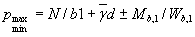 где Значениями R, рассчитанными по формуле (33), можно также пользоваться для окончательного назначения размеров фундаментов, если основание сложено горизонтальными, выдержанными по толщине слоями грунта (уклон не более 100%), сжимаемость которых не увеличивается в пределах глубины, равной двойной ширине наибольшего фундамента, считая от его подошвы. В случаях, когда расчетные значения сцепления сII и угла внутреннего трения грунта φII определены при изысканиях или по таблицам, составленным на основании обобщения региональных данных, значения R рекомендуется определять по формуле (7) СНиП 2.02.01-83 с учетом возможного его повышения на 20% в соответствии с указаниями п. 2.47 СНиП. При опирании фундаментов на конструктивную подсыпку (схема II, п. 8.10) указанное повышение рекомендуется производить как при расчете R по формуле (7) СНиП, так и по формуле (33) настоящих Рекомендаций без определения деформаций основания. 9.6. Краевое давление на грунт под подошвой вдоль оси внецентренно нагруженного фундамента вычисляется по формуле где N - нормативная вертикальная нагрузка; b, 1 - ширина и длина подошвы; Если при расчете оказывается, что рmin < 0, то подошва фундамента неполностью касается грунта и принимается рmin = 0