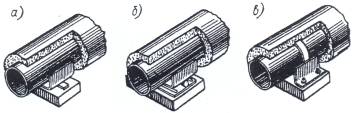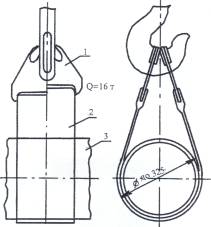 а - скользящая; б - катковая; в - неподвижная Рисунок 2 - Опоры в теплофикационных каналах 2.5 В непроходных каналах с трубопроводами с ППУ-изоляцией по длине трубопроводов через 100 м следует устраивать глухие противопожарные перегородки первого типа. При вводе трубопроводов в здание непроходные каналы должны отделяться от здания глухими противопожарными перегородками первого типа. 2.6 Для компенсации температурных деформаций теплопроводов в непроходных каналах рекомендуется использовать сильфонные компенсаторы либо Z- и П-образные компенсаторы и углы поворота в соответствии с проектом. В зависимости от диаметра труб с учетом нагрузок на опоры выбирается расстояние между опорами. Для опирания труб в канале следует выбирать подвижные скользящие диэлектрические опоры с подушками или каткового типа, а также неподвижные опоры. Типы различных опор, применяемых в теплофикационных каналах, приведены на рисунке 2. 2.7 При строительстве тепловых сетей в непроходном канале выполняются следующие работы: - подготовка канала, трассы (земляные, бетонные работы); - раскладка труб на трассе, их подрезка и установка; - сварка стыков труб и фасонных деталей; - устройство опор, компенсаторов, фасонных участков, монтаж запорной аппаратуры; - устройство изоляции (установка и закрепление скорлуп); - испытание и приемка трубопровода. 2.8 Подготовка трассы и строительство каналов проводятся в соответствии с требованиями СНиП 3.02.01-87 «Земляные сооружения, основания и фундаменты», строительство каналов по пособию ПП 27-2.2-93 АО «Моспроект». По этим видам работ должны быть разработаны специализированными организациями свои технологические карты. 2.9 После подготовки канала (без перекрытия) и устройства теплофикационных камер проводится раскладка труб и при необходимости их подрезка, установка фасонных деталей, опор и компенсаторов. Соединение деталей производится электросваркой, после чего сварной шов очищается от шлака металлической щеткой и наждачным кругом при помощи электрифицированного или ручного инструмента. 2.10 Спуск труб в канал производится автокраном или трубоукладчиком с помощью «полотенец» типа ПМ-321, характеристика которых приведена в таблице 2, или других захватных приспособлений, которые обеспечивают сохранность изоляционного покрытия, как показано на рисунке 3. Строповка теплопроводов тросом за изолированные участки и концы труб запрещена. Таблица 2 - Характеристика захватного приспособления типа ПМ-321