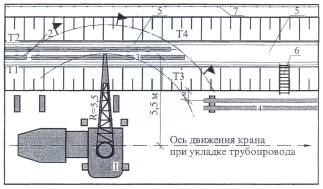 1 - кран; 2 - центратор; 3 - траверса; 4 - звено труб; 5 - непроходной канал; 6 - лестница для спуска в траншею; 7 - временное ограждение Т1 и Т2, Т3 и Т4 рабочие места исполнителей
