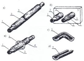 1 - стальная праймированная труба; 2 - битумоперлитовая изоляция; 3 - покровный слой из стеклоткани на битумно-пропиленовой мастике; 4 - покровный слой из стеклоткани на битумно-каучуковой мастике; 5 - железобетонная стенка; 6 - стальной упорный фланец; а - изолированная туба; б - щитовая неподвижная опора; в - изолированный элемент неподвижной опоры; г - битумоперлитовая скорлупа изогнутая; д - битумоперлитовая скорлупа прямая Рисунок 9 - Трубы и комплектующие изделия для тепловых сетей, изолированных битумоперлитомДля прокладки в непроходных каналах рекомендуется типовая конструкция трубопровода с антикоррозионным слоем СБП покрытия или битумно-каучукового покрытия и покрытием битумно-цементо-бензиновым праймером, битумоперлитовой изоляцией и монолитной экструзионной полиэтиленовой оболочкой или оболочкой из проклеенной битумной мастикой стеклоткани. Допускается применение пленки ПИЛ в качестве наружной защитной оболочки, а для стыков использование термоусаживающихся муфт и лент, либо пленки ПИЛ по стеклоткани. 2.20 Для противокоррозионной защиты наружной поверхности стальных труб тепловых сетей (температура теплоносителя до 180 ºС), прокладываемых в непроходных каналах, может применяться органосиликатная композиция ОС-51-03 зеленая (холодного отверждения). Композицию ОС-51-03 наносят на подготовленную и сухую поверхность трубопроводов непосредственно после операции обезжиривания растворителем и сушки при температуре окружающего воздуха не ниже минус 20 и не выше плюс 40 ºС. На поверхность труб покрытие можно наносить кистью, валиком, пневматическим или безвоздушным распылителем. При холодном отверждении покрытий с отвердителем ТБТ на поверхность труб тепловых сетей наносят четыре слоя органосиликатной композиции ОС-51-03. После отверждения толщина покрытия должна составлять 200-350 мкм. 2.21 Также для противокоррозионной защиты наружной поверхности стальных трубопроводов тепловых сетей, транспортирующих теплоноситель с температурой до 150 ºС и прокладываемых в непроходных каналах, может использоваться температуростойкий изол. Технологический процесс нанесения изольной изоляции включает в себя следующие стадии: - подготовку металлической поверхности трубопровода под окраску; - нанесение слоя битумной грунтовки; - сушку грунтовочного слоя; - навивку в два слоя изола с одновременным нанесением на поверхность ленты изольной мастики; - нанесение одного слоя оберточной бумаги. Изоляцию стыков труб выполняют после сварки стыков, опрессовки и приемки участка трубопровода. Очищенную металлическую поверхность стыка и края изоляции грунтуют изольной мастикой, просушивают в течение 10 мин. после чего спирально наматывают ленту изола с нахлестом витков, на 20-30 мм превышающим половину ширины ленты. В процессе намотки на внутреннюю сторону ленты наносят тонкий слой мастики. Изоляцию стыков выполняют при температуре окружающего воздуха не ниже минус 15 ºС. Для работы при низких температурах изол нарезают на ленты, скатывают в катушки, прогревают в теплом помещении и к месту работ доставляют в утепленном ящике. Мастику, также прогретую в теплом помещении, доставляют в термосе вместимостью 10-12 л. 2.22 По окончании монтажных работ трубопроводы испытывают давлением на прочность и герметичность. Испытания проводятся гидравлическим с