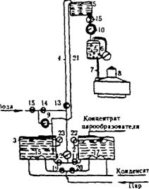 Рис.1. Пеногенератор конструкции ЦНИИЭПсельстрой. Пеногенератор с выгрузкой готовой пены центробежным насосом представлен в общем виде на рис.1. Принцип действия его состоит в следующем. Отдозированное количество рабочего раствора пенообразователя заливается в бак 1. Трехходовой кран 2 при этом открыт в положении "циркуляция", и раствор пенообразователя (пеномассы) центробежным насосом 3 подается к разбрызгивающему устройству 4. При прохождении раствора (пеномассы) через всасывающий трубопровод 5 в трубке подсоса 6 создается разрежение, благодаря чему обеспечивается подача воздуха к рабочему колесу насоса. Этот воздух разбивается колесом насоса на мельчайшие пузырьки, которые равномерно распределяются в пеномассе, повышая ее воздухосодержание. По окончании приготовления пены (2...3 мин.) трехходовой кран переводится в положение "выгрузка" и готовая пена подается в смеситель, где происходит ее смешивание с остальными компонентами бетонной смеси. Пеногенератор рекомендуется применять для приготовления технической пены с кратностью 7...8.