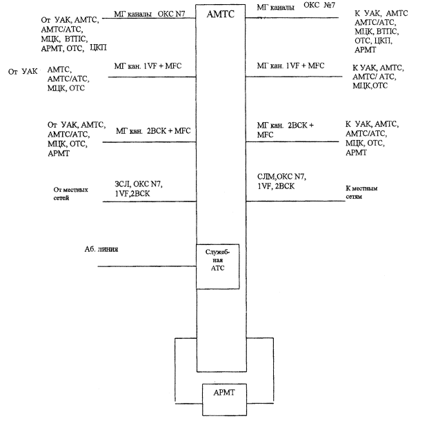 4. Технические требования4.1 Требования к емкости и производительности станции4.1.1 Должно обеспечиваться построение АМТС различной емкости, включая емкость 60000 каналов и линий. 4.1.2 Производительность управляющих устройств АМТС должна обеспечивать обслуживание телефонной нагрузки до 0,8 Эрл на один канал. 4.1.3 Управляющий комплекс АМТС должен обеспечивать обработку нагрузки не менее 30000 Эрл и не менее 690000 вызовов в ЧНН при емкости АМТС 60000 каналов и линий. 4.1.4 Коэффициент использования процессора в нормальных условиях (в отсутствии перегрузок и неисправностей) не должен превышать 0,85. 4.2 Требования к основным функциям АМТС4.2.1 АМТС должна выполнять следующие основные функции: - установление исходящих и входящих соединений для передачи информационных сообщений; - прием и анализ сигнальной информации и выдачу сигнальной информации; - выбор направлений при установлении соединений; - защиту телефонных разговоров от мешающего воздействия эффекта электрического эха; - определение категории и номера вызывающего абонента (АОН); - учет данных для начисления платы; - сбор и обработку данных по трафику и качеству обслуживания; - установление входящих, исходящих соединений от/к абонентам служебной АТС. 4.2.2 АМТС должна обеспечивать следующие виды коммутации: - коммутацию каналов на скорости 64 кбит/сек; - полупостоянную коммутацию каналов на скорости 64 кбит/с. 4.2.3 АМТС должна обеспечивать предоставление: - исходящих и входящих автоматических и полуавтоматических международных, междугородных и внутризоновых соединений; - выход к центрам коммутаций подвижной связи (ЦКП); - соединений с заказными, справочными и иформационно-справочными междугородными и международными службами, организованными на АМТС; - входящих и исходящих соединений от телефониста служб АМТС к аналогичным службам АМТС, комбинированных АМТС/АТС, УАК, МЦК и МНТС сети ТФОП; - входящих и исходящих соединений между абонентами служебных АТС сети ТФОП. 4.2.4 К АМТС могут быть подключены следующие типы каналов и линий (рисунок 4.1): - цифровые и аналоговые междугородные телефонные каналы для связи с другими АМТС, комбинированными АМТС/АТС, УАК, МЦК (МНТС), ОТС, ВТПС, ЦКДАРМТ; - цифровые и аналоговые заказно-соединительные линии (ЗСЛ) и соединительные линии междугородные (СЛМ) для связи со станциями и узлами местных телефонных сетей зоны; - цифровые соединительные линии к автоматизированным рабочим местам телефонистов (АРМТ); - цифровые соединительные линии к служебной АТС, при условии, что оборудование служебной АТС не совмещено с АМТС; - цифровые абонентские линии для подключения абонентских установок подсистемы служебной связи АМТС (служебная АТС совмещена с АМТС). Примечание - Аналоговые каналы и линии могут подключаться к АМТС через АЦП или конверторы сигнализации. 4.2.5 АМТС должна обеспечивать возможность осуществления внутризоновой, междугородной и международной связи с пунктом назначения по прямым путям и путям последнего выбора (до 8-ми направлений). При отсутствии прямого направления выбирается путь последнего выбора (ППВ). Выбор маршрута установления соединения на АМТС должен осуществляться по анализу (от одного до семи знаков) принимаемой номерной информации. Количество направлений, включаемых в станцию, может быть до 256. 4.2.6 При установлении междугородных и международных сое