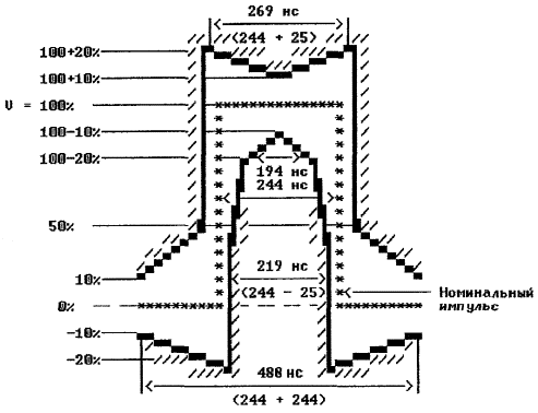 4.6.4.4 Значение отношения полезного сигнала к интерференциальной помехе, воздействующей на входной сигнал, при котором отсутствуют искажения, должно быть 18 дБ. 4.6.5 Экран симметричной пары на передачу должен заземляться, в случае необходимости должна быть предусмотрена возможность заземления экрана симметричной пары на прием. 4.6.6 Электрические характеристики интерфейса Z 4.6.6.1 Номинальное значение станционного импеданса представляет собой комплексное сопротивление ZL, приведенное на рисунке 4.3, где для интерфейса Z - R1=150 Ом, R2=510 Ом, С=47 нФ. Рисунок 4.3 - Полное комплексное сопротивление ZL (испытательный контур) 4.6.6.2 Затухание несогласованности по отношению к испытательному контуру, равному ZL, должно быть для интерфейса Z: - не менее 14 дБ в диапазонах от 300 до 500 Гц и от 2000 до 3400 Гц; - не менее 18 дБ в диапазоне от 500 до 2000 Гц; 4.6.6.3 Затухание асимметрии относительно "земли" должно быть не менее 40 дБ в диапазоне частот от 300 до 600 Гц и не менее 46 дБ в диапазоне частот от 600 до 3400 Гц. 4.6.6.4 Номинальные значения относительных входных (Li) и выходных (Lo) уровней, измеренные на частоте 1020 Гц при нагрузке на полное комплексное сопротивление ZL, должны быть для стыка Z- Li=0 дБо, Lo=-7 дБо; Допускается увеличение номинального значения Lo до 0 дБо с шагом 1 дБо. Разница между номинальным и действительным относительным уровнем должна находиться в пределах: - входной относительный уровень: от минус 0,3 до 0,7 дБ; - выходной относительный уровень: от минус 0,7 до 0,3 дБ. 4.6.7 Характеристики интерфейса STM1 4.6.7.1 Характеристики интерфейса STM1 электрического 4.6.7.1.1 Общие характеристики: - скорость передачи 155520 Кбит\с; - допуск скорости передачи +\- 20×10-6; - код: двухуровневый код с инверсией посылок (CMI). 4.6.7.1.2 Параметры на выходных портах: - форма импульса - номинально прямоугольная и соответствующая маскам, представленным на рис 24\G.703 и 25\G.703 МСЭ-Т [3]; - пары в каждом направлении - одна коаксиальная пара; - измерительное нагрузочное сопротивление - 75 Ом, активное; - напряжение при размахе - 1+\-0,1 В. - время нарастания между 10% и 90% от измеренной стационарной амплитуды ≤2 нс, - допуск на временные соотношения переходов (относится к среднему значению для точек с 50% амплитуды отрицательных переходов) - отрицательные переходы: +\- 0,1 не; положительные переходы на границах единичных интервалов: +\- 0,5 не; положительные переходы в середине единичных интервалов: +\- 0,35 нc; - затухание отражения - ≥15 дБ в диапазоне частот 8-240 МГц; - максимальное фазовое дрожание (при размахе) на выходном порту - в соответствии с G.825 [20] 4.6.7.1.3 Параметры на входных портах Параметры на входных портах соответствуют параметрам на выходных портах с учетом изменений параметров, обусловленных характеристиками соединительной коаксиальной пары. Примечание - Затухание коаксиальной пары должно приблизительно соответствовать закону √f, а максимальное вносимое затухание должно составлять 12,7 дБ при частоте 78 МГц. 4.6.7.1.4 Параметры в точках переключения Глазковая диаграмма при максимальном и минимальном уровнях мощности представлена на рис. 26\G.703 МСЭ-Т [3]. 4.6.7.2 Характеристики интерфейса STM1 оптического должны соответствовать рекомендации МСЭ-Т G..957 [21]. 4.6.8 Характеристики тракта передачи полусоединений 4.6.8.1 Рабочее затухание передачи определяется как разность относительных уровней на входе и выходе соединения на частоте 1020 Гц. Показатели номинальног