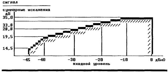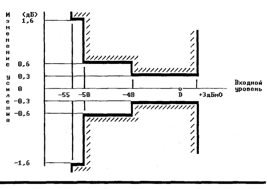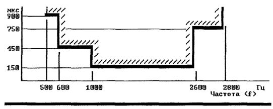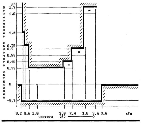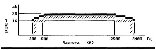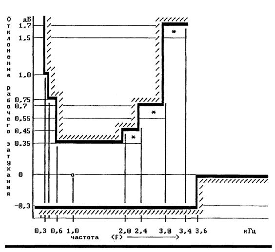 4.6.8.6 Защищенность от внятных переходных влияний включает в себя переходные влияния между разными полусоединениями: - от аналогового входа между различными полусоединениями на дальнем и ближнем конце. Синусоидальный сигнал с частотой 1020 Гц и уровнем 0 дБмО, поданный на аналоговый двухпроводный интерфейс одного полусоединения, не должен создавать переходную помеху на входе любого другого полусоединения с уровнем, превышающим минус 73 дБмО на ближнем конце и минус 70 дБмО на дальнем конце; Рисунок 4.5 - Пределы отклонения группового времени прохождения между интерфейсами Z, А и A-Z *В указанных частотных диапазонах приведены пределы, которые применяются при использовании максимальной протяженности внутристанционного кабеля. Рисунок 4,6 - Частотная зависимость отклонения рабочего затухания на входе полусоединения (интерфейс Z) - от цифрового входа между различными полусоединениями на дальнем и ближнем конце. Цифровой синусоидальный сигнал с частотой 1020 Гц и уровнем 0 дБмО, поданный на цифровой вход одного полусоединения, не должен создавать переходную помеху на выходе любого другого полусоединения с уровнем, превышающим минус 70 дБмО на ближнем конце и минус 73 дБмО на дальнем конце. * В указанных частотных диапазонах приведены пределы, которые применяются при использовании максимальной протяженности внутристанционного кабеля. Рисунок 4.7 - Частотная зависимость отклонения рабочего затухания на выходе полусоединения (интерфейс Z) 4.6.8.7 Отношение сигнала к суммарным искажениям на входе/выходе полусоединения при измерении синусоидальным сигналом с частотой 1020 Гц на аналоговом входе интерфейса Z, или синусоидальным цифровым сигналом с той же частотой на цифровом входе соединения (интерфейсы А) должно превышать пределы, указанные на рисунках 4.8 и 4.9 для интерфейса Z. Рисунок 4.8 - Пределы суммарных искажений на входе соединения при Li=0 дБО интерфейса Z Рисунок 4.9 - Пределы суммарных искажений на выходе соединения (Lo = -7 дБо интерфейса Z) 4.6.8.8 При подаче на аналоговый вход интерфейса Z любого синусоидального сигнала в диапазоне от 4,6 до 72 кГц с уровнем минус 25 дБмО уровень любой комбинационной частоты, возникающей на выходе соединения, должен быть по крайней мере на 25 дБ ниже уровня испытательного сигнала. В самых неблагоприятных условиях национальной сети на цифровом выходе интерфейса Z не должно возникать дополнительного шума более 100 пВт0п в полосе частот от 10 до 4000 Гц, вызванного присутствием внеполосных сигналов на входе соединения. 4.6.8.9 При подаче на цифровой вход полусоединения интерфейса Z цифрового синусоидального сигнала в диапазоне частот от 300 до 3400 Гц с номинальным уровнем 0 дБмО уровень внеполосных сигналов, измеренный селективно на аналоговом выходе полусоединения, должен быть менее минус 25 дБмО. 4.6.8.10 Балансное затухание дифсистемы при нагрузке аналогового входа интерфейса Z номинальным комплексным сопротивлением должно превышать пределы, приведенные на рисунке 4.10. Рисунок 4.10 - Пределы балансного затухания дифсистемы 4.6.8.11 Устойчивость дифсистемы при холостом ходе и коротком замыкании в точке двухпроводного аналогового входа должна быть не менее 6 дБ для интерфейса Z в диапазоне частот от 200 до 3600 Гц. При изменении выходного относительного уровня Lo интерфейса Z допускается соответствующее уменьшение устойчивости, но н
