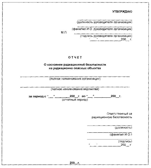 * В колонке 1 следует указывать точные названия документов для данного РОО. 2.10. Учет и хранение открытых радионуклидных источников на радиационно опасных объектах организации2.10.1. Сведения инвентаризационного характера о наличии на РОО открытых радионуклидных источников следует представлять по форме Ф10.1-ОСРБ. К форме Ф10.1-ОСРБ должен быть приложен акт инвентаризации открытых радионуклидных источников. При наличии а организации нескольких РОО данная форма тиражируется с заменой строк 5-7. Формы нумеруются в виде Ф10.1-ОСРБ/1 ... Ф10.1-ОСРБ/N. Форма Ф10.1-ОСРБ Сведения о наличии открытых радионуклидных источников на радиационно опасном объекте организации