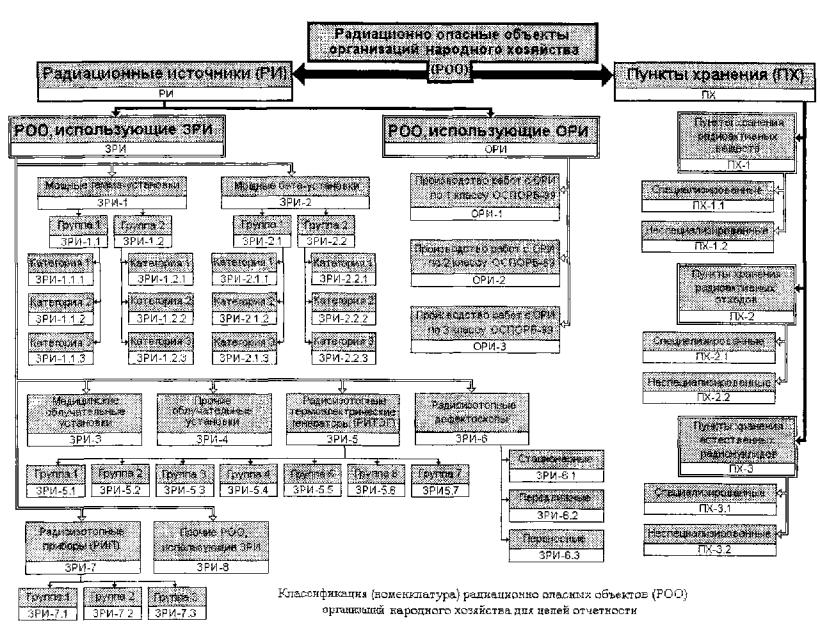Приложение 2Классификация радиационно опасных объектов организаций народного хозяйства для целей отчетности о состоянии радиационной безопасностиПредставленная ниже классификация радиационно опасных объектов организаций (предприятий) народного хозяйства предназначена для целей отчетности, а именно для упорядочения сведений о поднадзорных Госатомнадзору России РОО и о состоянии радиационной безопасности на них при осуществлении разрешенной (а соответствии с лицензиями Госатомнадзора России) деятельности в области использования атомной энергии в народном хозяйстве. Для