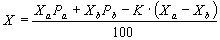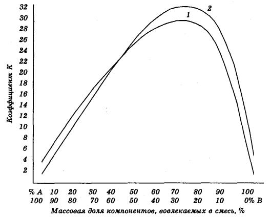 где Х - вязкость (температура вспышки в закрытом тигле) смеси, мм2/с, °C; Ха, Хb - вязкость (температура вспышки) компонентов, вовлекаемых в смесь, мм2/с, °C. При этом за Ха принимают большую из величин; Ра, Рb - массовая доля компонентов в смеси, %; K - эмпирический коэффициент, определяемый по кривой 1 при расчете вязкости и по кривой 2 при расчете температуры вспышки (рис.1).