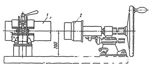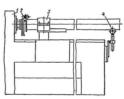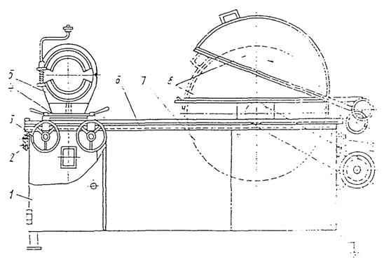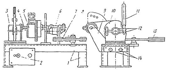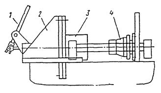 внешнего нагрева: 4.2.10.Устройство для отбортовки фторопластовых труб диаметром 32…236 мм без внешнего нагрева, основанное на способе раскатки холодных концов труб на токарных станках, приведено на рис. 4.13. Оно состоит из отбортовочной головки 2, зажима для труб 3 и поддерживающей роликоопоры 4. 4.2.11. Формование раструбов. Формование выполняют для сварки в раструб напорных трубопроводов из ПЭВД ПЭНД, и ПП, а также сварки нагретым газом и склеивания напорных трубопроводов из ПВХ В технологический процесс формования раструбов на концах пластмассовых труб входят следующие операции: разогрев конца трубы, закрепление трубы перед формованием, формование раструба на разогретом конце трубы, охлаждение отформованного раструба, освобождение готового изделия от закрепления. Рис. 4.13. Устройство для отбортовки фторопластовых труб без нагрева 4.2.12. Перед формованием раструба конец трубы нагревают до высокоэластичного состояния. Температура теплоносителя для нагрева концов труб под раструбы соответствует температуре нагрева, рекомендуемой при формовании отбортовок (см. табл. 4.4). Отформованный раструб охлаждают вместе с пуансоном. Применяется принудительное охлаждение раструба проточной водой или сжатым воздухом до температуры не выше 35°С. В изготовленный раструб для сохранения его размеров вставляют распорное инвентарное приспособление, наружный диаметр которого равен диаметру формующего пуансона. Это приспособление из раструба вынимают только перед сваркой или склеиванием. Изготовляют располные приспособления из отрезков металлических труб или из дерева твердых пород. Рис.4.14. Устройство для формования раструба на концах труб 4.2.13. Формование раструбов на конце нагретых труб выполняют с помощью ручных винтовых устройств (рис. 4.14), состоящих из зажима труб с вкладышами для труб различного диаметра, винтового механизма, на конце которого навинчиваются пуансоны, формующие раструб. Подача пуансона 2 внутрь нагретой трубы 1 выполняется с помощью винтового подающего механизма. В разогретый конец вводится пуансон до упора, который предохраняет от деформации участок трубы за формуемым концом. 4.2.14. Формование раструбов на конце пластмассовых труб производится также с помощью станков с различными приводами - электромеханическим, гидравлическим или пневматическим. На рис 4.15 показан универсальный станок для формования отбортовок и раструбов пластмассовых труб диаметром до 315 мм. Рис. 4.15. Универсальный станок для формования