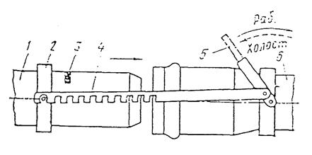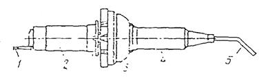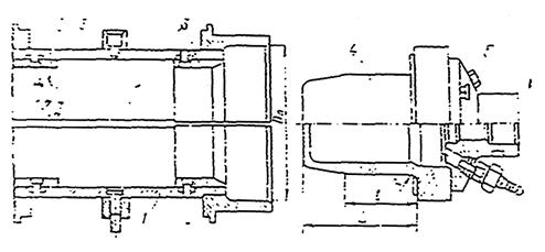 315 мм Рис. 4.3. Маятниковая пила ПМ 300/400 Рис.4.4. Маятниковая пила ПМ300/80 Рис. 4.5. Станок для резки Пластмассовых труб диаметром до 160 мм Рис. 4.6. Трубное сверло Рис. 4.7. Устройство для торцовки и снятия фасок на концах пластмассовых труб в монтажных условиях 4.1.12. Обработка торцов труб. В условиях трубозаготовительных мастерских обработку торцов пластмассовых труб диаметром 50…225 мм выполняют на специальных станках для механической обработки труб. На этих станках выполняются следующие операции: обработка внутренних и наружных фасок; торцовка труб с прямым и косым резом; обработка концов труб для элементов соединительных деталей; сверление отверстий в трубах для переходных тройников. 4.1.13. В условиях монтажной площадки торцовка пластмассовых труб диаметром 50…315 мм и снятие фасок производится с помощью комплекта специальных устройств (рис. 4.7). 4.2. Формование соединительных деталей4.2.1. Формованием изготовляют втулки с утолщенными буртами под стальные свободные фланцы, отбортовки концов труб, раструбы, переходы, горловины переходных тройников, а также производят калибровку концов труб. 4.2.2. Изготовление втулок под фланец с утолщенными буртами. При монтаже трубопроводов из полиэтилена и полипропилена применяют разъемные соединения со стальными свободными фланцами на утолщенных буртах, отформованных на концах труб или коротких патрубках. Основные размеры формованных втулок с утолщенными буртами приведены в табл.4.1. Технологический процесс формования утолщенных буртов состоит из следующих операций: разогревают конец трубы, закрепляют его, формуют, охлаждают отформованный бурт и освобождают готовое изделие от закрепления. Длина нагреваемого участка конца трубы должна быть в 1,5 раза больше длины формуемого участка трубы. 4.2.3. Электронагревательное устройство для труб диаметром 63…160 мм (рис. 4.8) представляет собой цилиндрический корпус 1, внутри которого имеются ТЭНы 2 (трубчатые нагревательные элементы) мощностью 2,8 кВт. Между ТЭНами и разогреваемой трубой размещены экраны 3 с отверстиями диаметром 3…4 мм, служащие для равномерного распределения нагретого воздуха по поверхности трубы. Воздух от компрессора, поступающий из распределительной камеры 5 по специальным каналам, подходит к ТЭНам, нагревается об их поверхность и переносит теплоту на наружную и внутреннюю поверхности нагреваемой трубы 4. Рис. 4.8. Схема устройства для нагрева концов труб 4.2.4. Температура нагрева воздуха внутри электронагревательного устройства (табл. 4.2.) поддерживают постоянной в заданных пределах с помощью терморегуляторов. Участок трубы, нагретый до температуры формования не должен терять форму устойчивости. Рекомендуемое время нагрева концов пластмассовых труб приведено в табл. 4.3. Табл. 4.2.Оптимальная температура теплоносителя и температура нагрева конца трубы