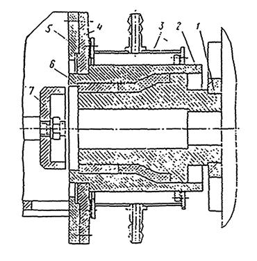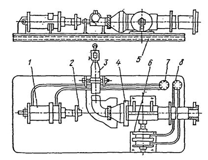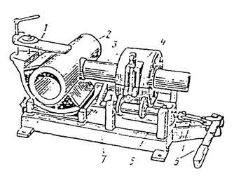 Соединительные детали должны выдерживать испытательное давление без признаков разрушения в течение не менее 1 часа. Нагружение испытываемой детали гидростатическим давлением до расчетной величины должно осуществляться за 20…60 секунд после заполнения образца рабочей жидкостью. В течение испытания давление в образце должно поддерживаться с точностью ±2 % от испытательного. Испытание проводят на специальных стендах. Испытываемый образец герметически закрывают заглушками, конструкция которых должна обеспечивать возможность подачи в образец гидравлической жидкости и полное удаление воздуха из испытываемого образца при заполнении его водой. Конструкция стенда должна обеспечивать возможность свободной деформации образцов при испытании. При получении неудовлетворительных результатов контрольной проверки деталей хотя бы по одному показателю (внешний вид, основные размеры, стойкость к внутреннему гидростатическому давлению) этот показатель контролируется повторно на удвоенном количестве образцов, взятых из той же партии. Результаты повторной проверки являются окончательными и распространяются на всю партию. 6.2. Оборудование для изготовления деталей.6.2.1. Изготовление сварных соединительных деталей должно производиться в условиях трубозаготовительных цехов и мастерских на специальном оборудовании, обеспечивающем правильное взаимное расположение свариваемых заготовок и соблюдение требуемых параметров сварки. 6.2.2. Для изготовления сварных соединительных деталей созданы различные устройства, отличающиеся конструктивным исполнением, но имеющие идентичные схемы работы. На рис. 6.2 приведено устройство для сварки соединительных деталей из труб DH=63…110 мм. Рис. 6.2. Устройство для сварки соединительных деталей пластмассовых трубопроводов DН=63…110 мм Устройство состоит из механизма для центровки и сварки заготовок труб, электронагревательного инструмента 6, инструмента для торцовки 5 и станины 4. Механизм для центровки и сварки труб состоит из двух подвижных во взаимно перпендикулярном направлении кареток. Перемещение каретки 2 производится с помощью винтовой пары и пары шестерен, перемещение каретки 1 -винтовой парой. Для закрепления труб различных диаметров каждая каретка имеет зажимные хомуты со сменными вкладышами 3. 6.2.3. С помощью устройства, показанного на рис. 6.2, производится изготовление сварных неравнопроходных тройников путем приварки патрубка ответвления к горловине, отформованной на основной трубе. Устройство состоит из подвижной 4 и неподвижной 1 кареток, ручного рычажного привода 5 подвижной каретки, пружинного устройства 6 для регулирования усилия осадки при сварке и сварного корпуса 7. В комплект устройства входят сменные вкладыши для зажима патрубка 3 и основной трубы 2, а также плоский электронагревательный инструмент. Патрубок зажимается в подвижной, а основная труба в неподвижной каретке. Рис.6.3. Устройство для сварки неравнопроходных тройников 7. ВЫПОЛНЕНИЕ РАЗЪЕМНЫХ СОЕДИНЕНИЙ ПЛАСТМАССОВЫХ ТРУБ7.1. Фланцевые соединения.7.1.1. При сборке фланцевых соединений затягивать болты нужно равномерно поочередным завинчиванием противоположно расположенных гаек и соблюдением параллельности фланцев. Не рекомендуется устранять перекос фланцев путем неравномерного натяжения болтов или применением 